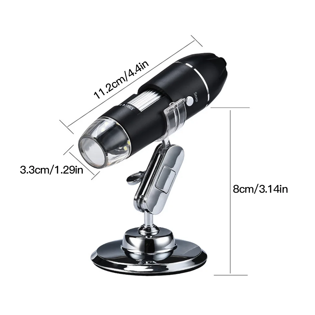 Размеры (Прибл.): высота: 12 см/4.72in; Микроскопа: 11*3 см/4,33 * 1.18in; Увеличение: 0-1600x; Пиксели: 2 миллион пикселей