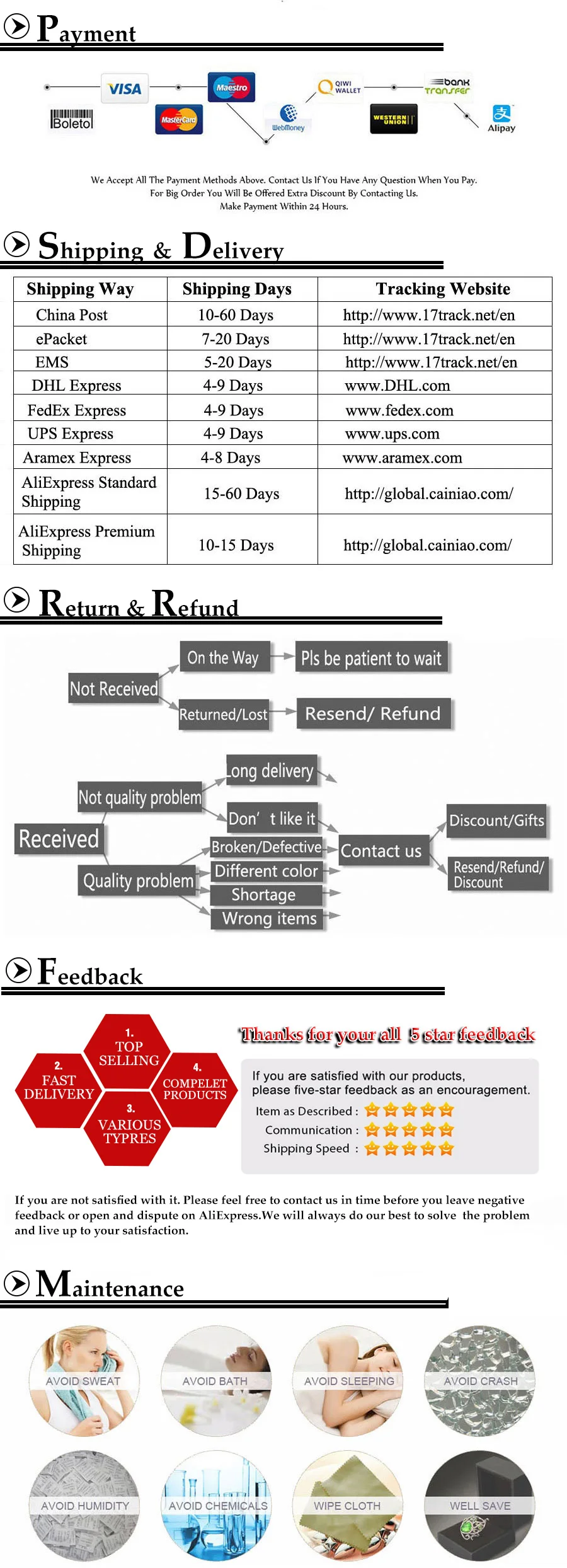 Доставка:(1) Мы отправим посылку в течение 1-7 дней после оплаты (2), когда сумма товара превышает 6 долларов США, мы отправим через epacket/china post air mail/aliexpress standrad shipping.(3) о Бразилии: в настоящее время в Бразилию мы отправляем только через aliexpress стандартную доставку, и если сумма вашего товара превышает 15 долларов США (не включает перевозку), пожалуйста, свяжитесь с нами, чтобы удалить доставку Стоимость.(4) поскольку мы не предоставляем бесплатную доставку для всех стран, если вы обнаружите, что ваш заказ имеет перевозку, и сумма заказа более 10 долларов США, пожалуйста, свяжитесь с нами, чтобы дать скидку на доставку.(5) Если ваш заказ превышает 200 долларов США, мы отправим его через dhl,UPS бесплатно, если есть доставка, пожалуйста, свяжитесь с нами, чтобы удалить все доставки Стоимость.