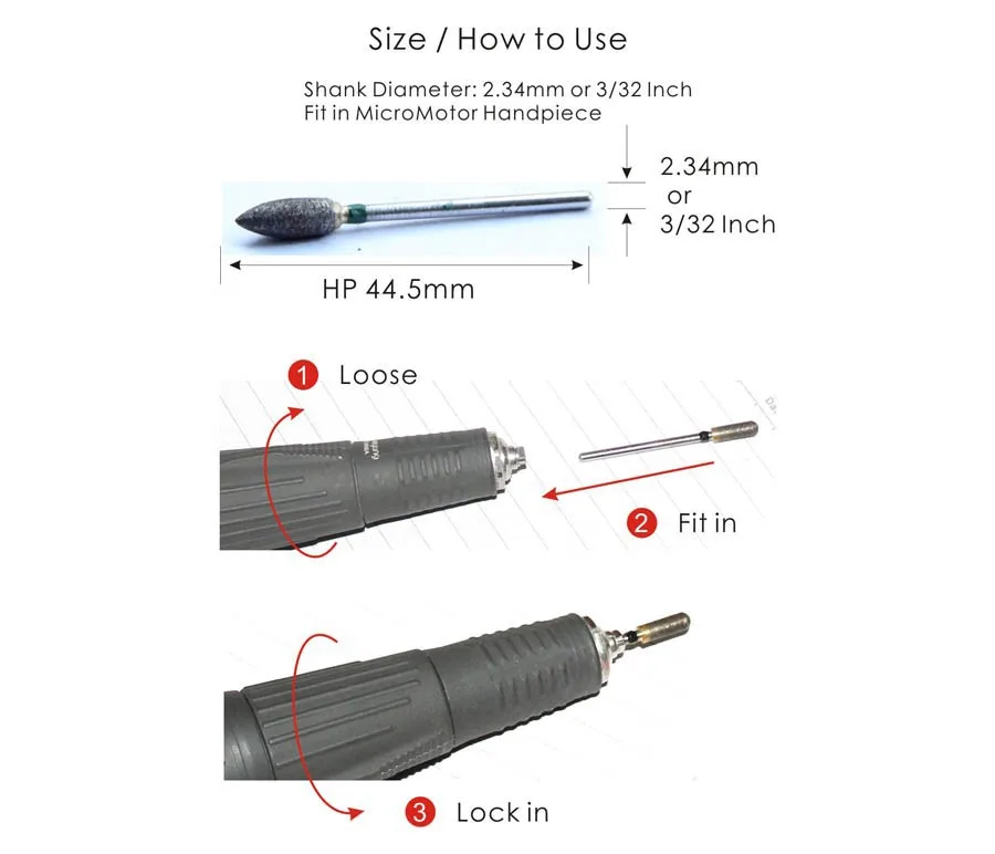 * Все боры имеют хвостовик HP, 3/32 ”, ISO104, диаметр хвостовика 2,35 мм. Подходит для электродвигателя micro.