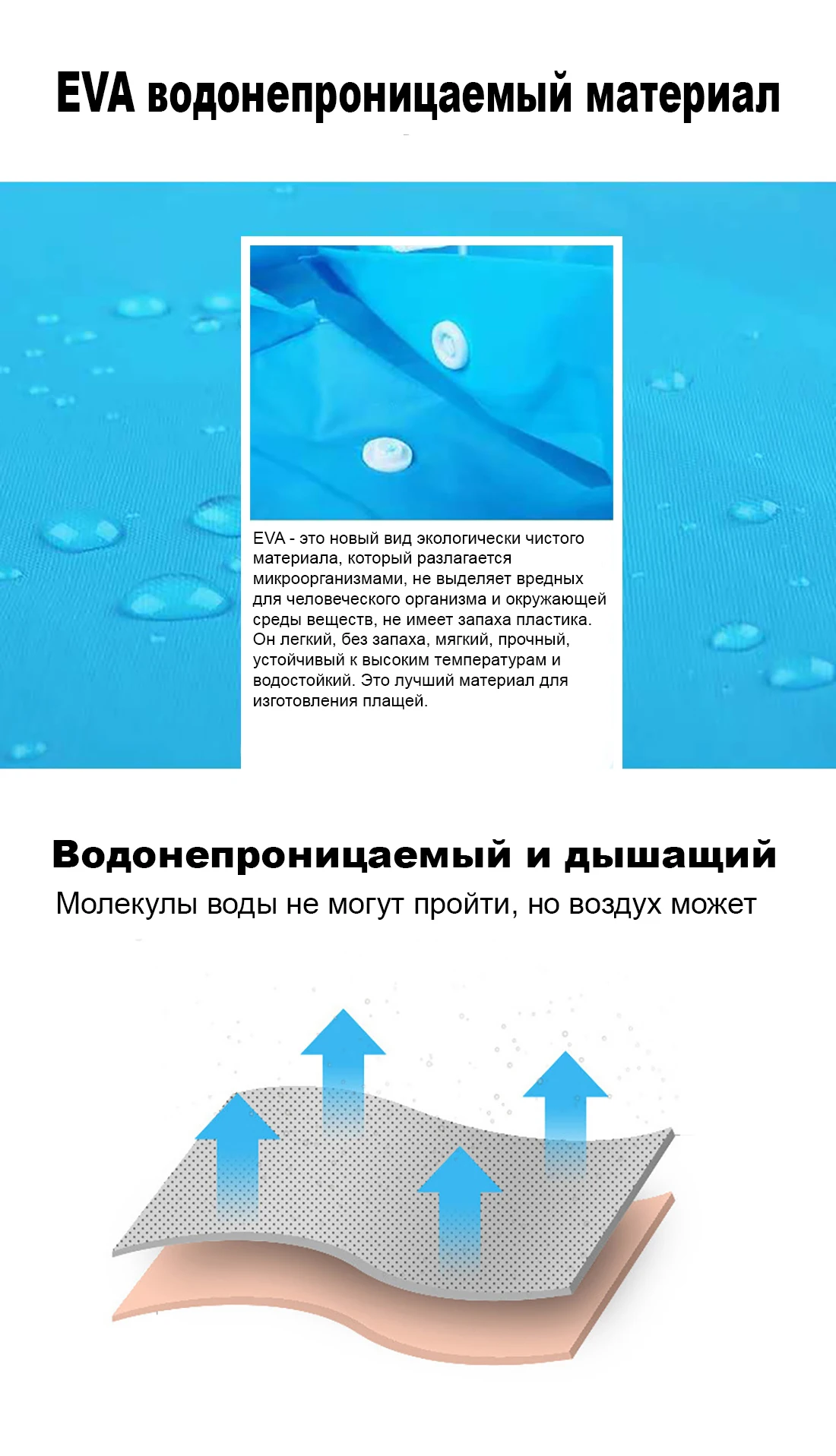 EVA-это новый тип экологически чистого материала. Это биоразлагаемый материал. Имеет преимущества легкости, запаха, мягкости и гибкости, высокой термостойкости и водонепроницаемости. Это высококачественный материал для изготовления плащей.