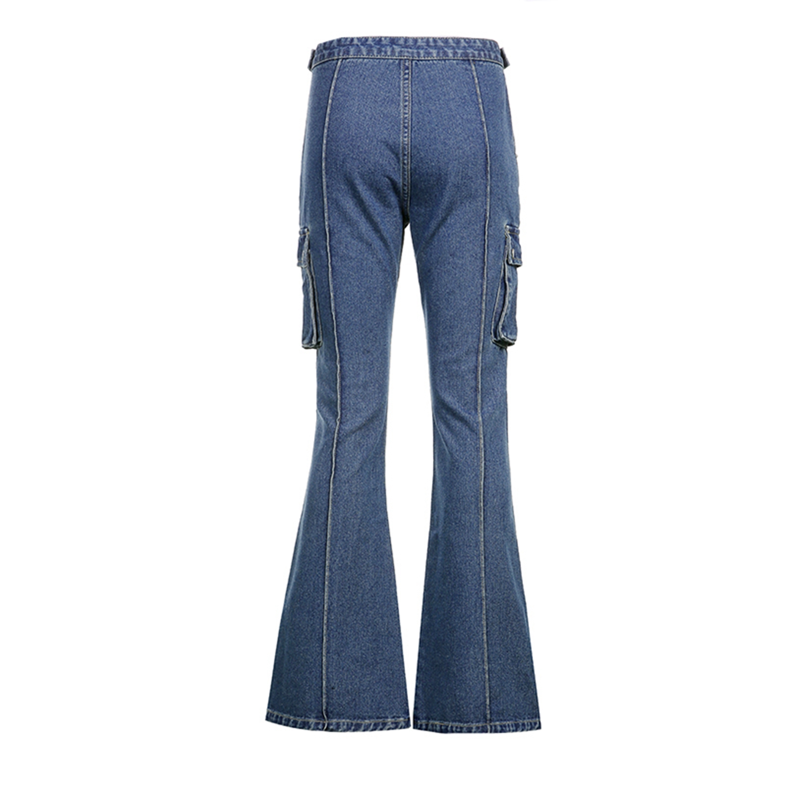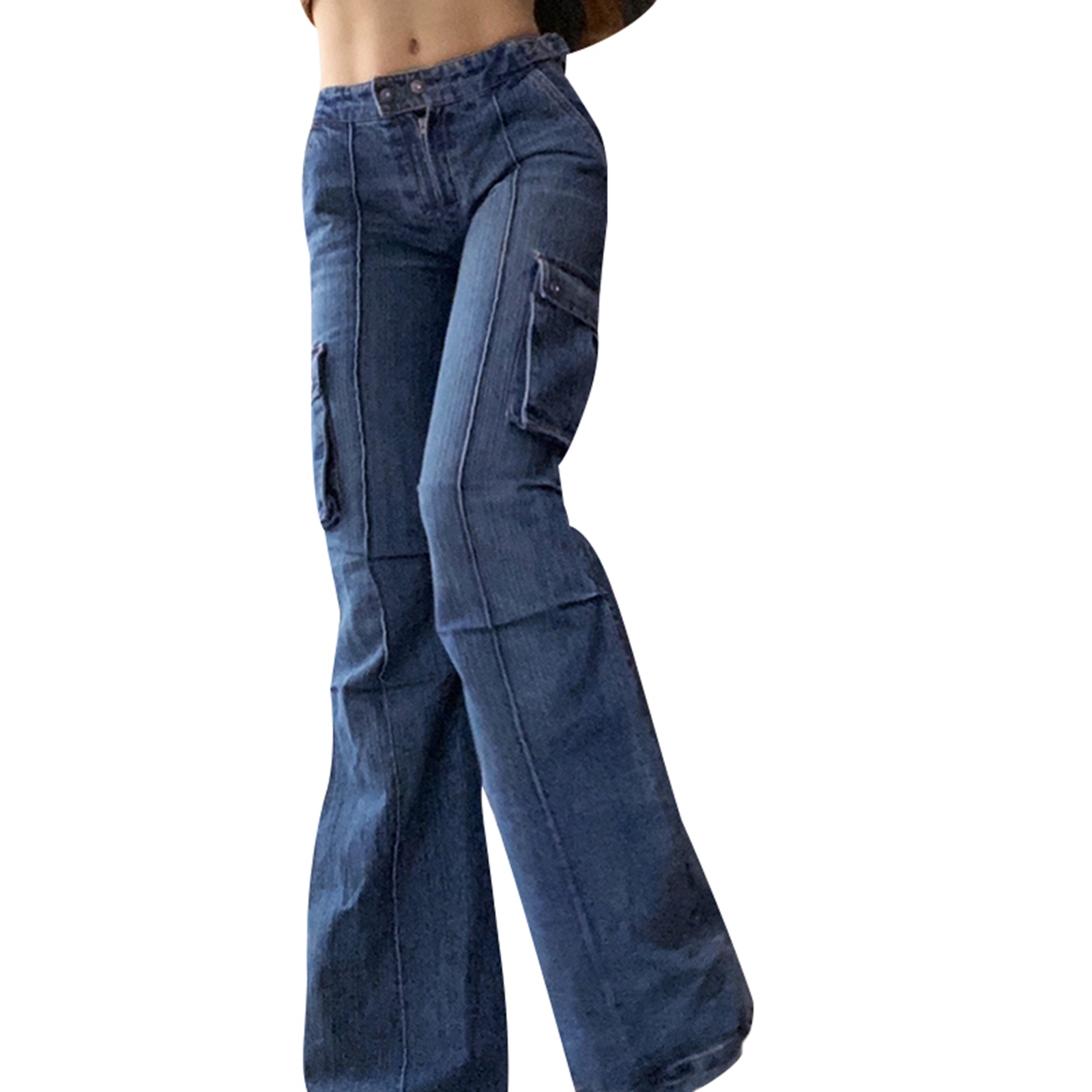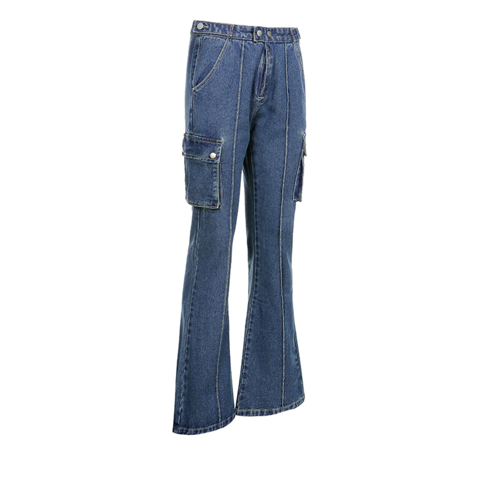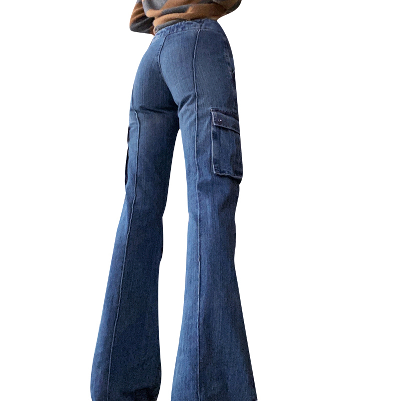 Women High Waist Denim Trousers, Solid Color Slim Fit Straight Long Pants with Side Pockets