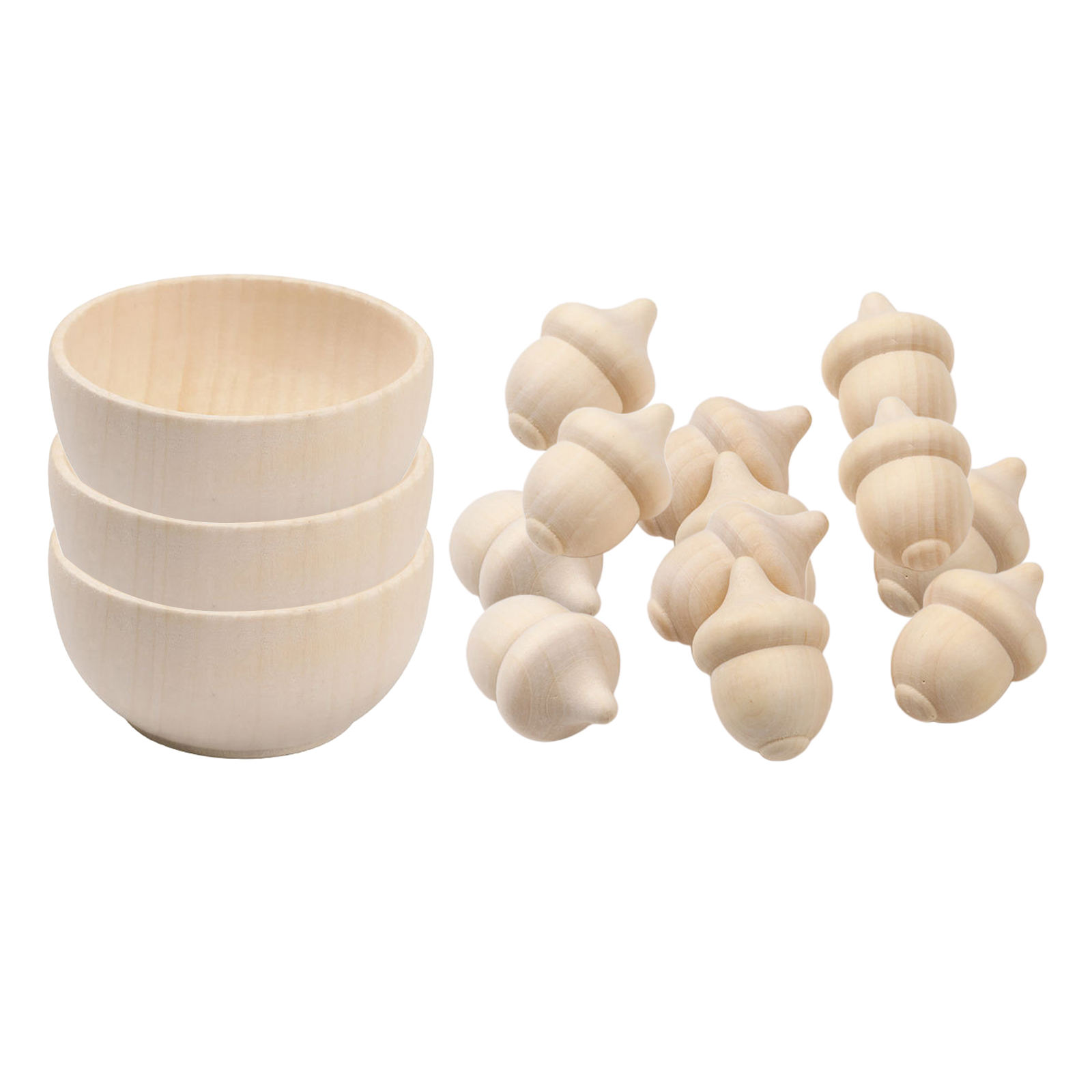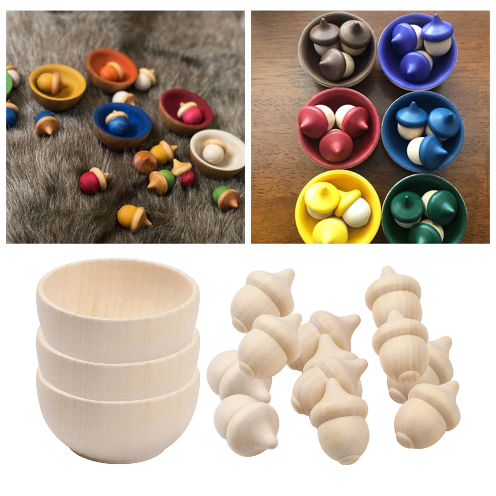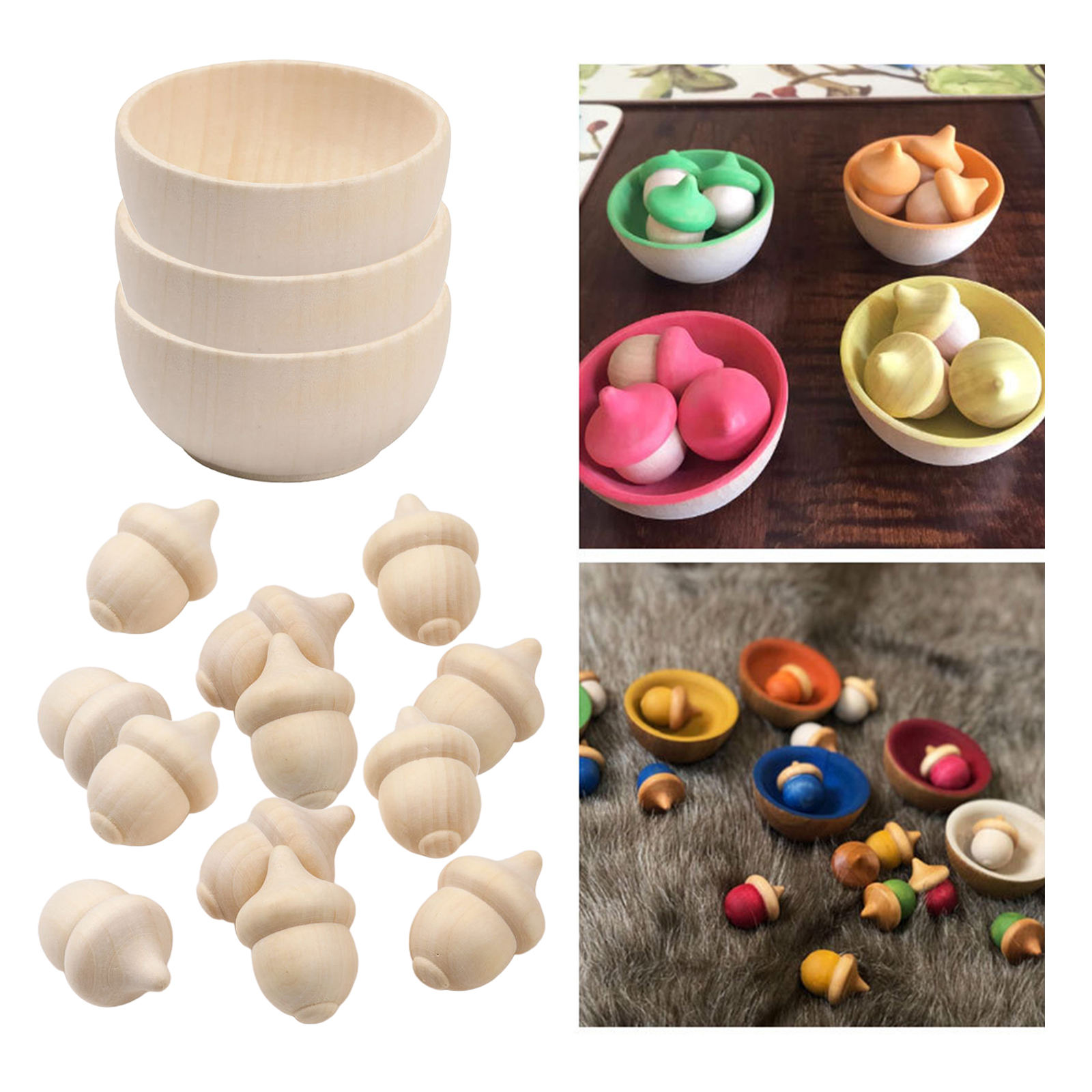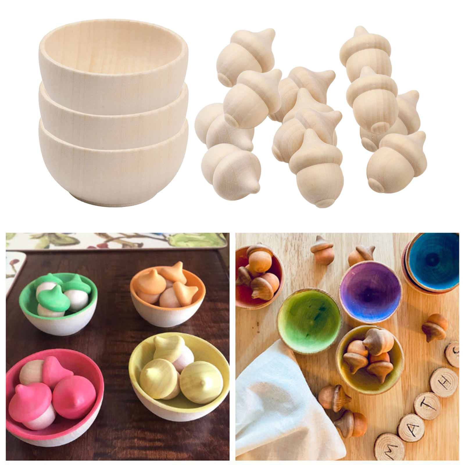 Набор для подсчета и сортировки деревянных желудей, 10 желудей и 3 миски, необработанные деревянные колышки для кукол, набор для игрушечных ремесел, Декор, окрашивание красок