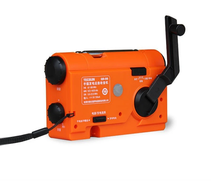 Tecsun 99 Оснащен функциями аварийной зарядки и освещения ручной генерации электроэнергии, подходит для работы на полях и пастбищных площадей и т. д. И это не удобно использовать, когда нет источника питания переменного тока, и это не удобно покупать батареи.