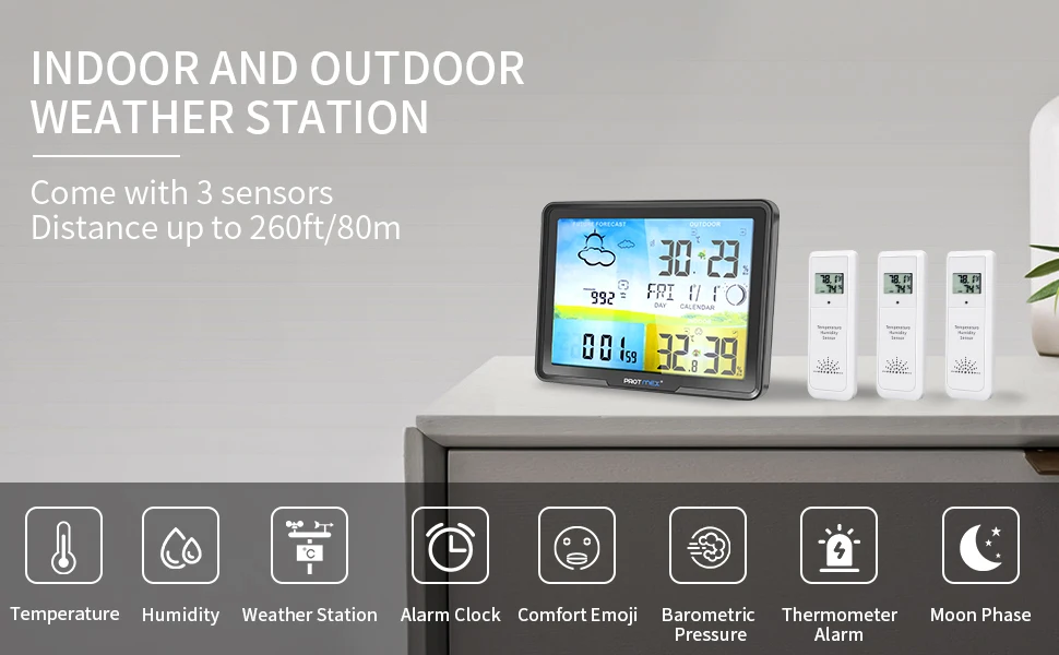 Эта цифровая Погодная станция с безпроводная Внутреняя наружный датчик может контролировать до 3 больше места, таких как спальня, гостиная, кухня, детская комната, теплица, гараж, подвал, подвал или склад. Выносной датчик обеспечивает дальность передачи до 80 м/260ft в открытой местности.