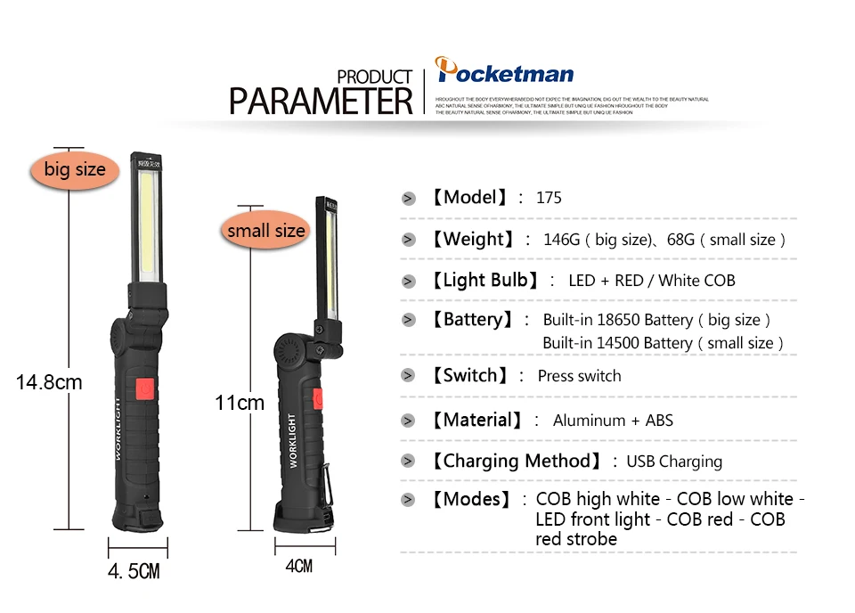 5 режимов: высокий светодиодный COB, низкий COB светодиодный, светодиодный, красный светильник (длинный пресс), мигающий красный светильник
