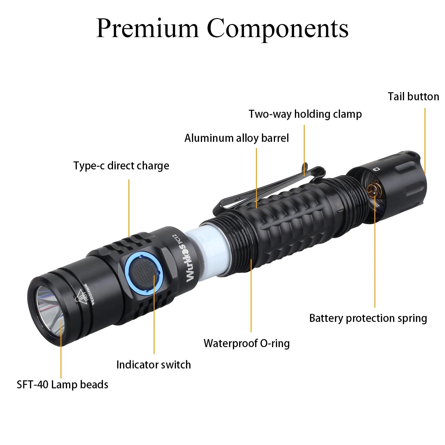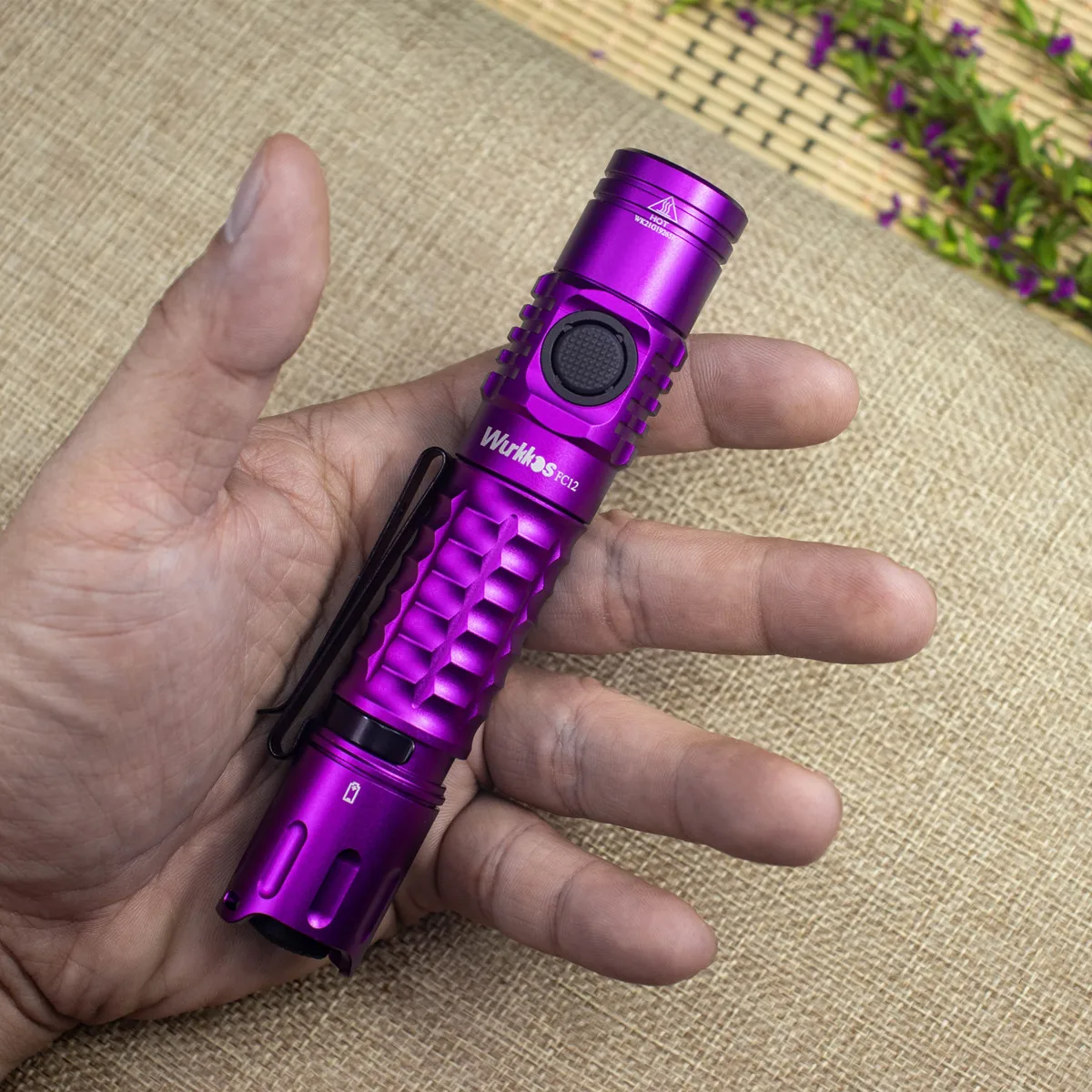 Wurkkos fc12это мощный, универсальный EDC/уличный фонарик, предназначенный для дома, EDC или активного отдыха, как кемпинг, туризм, рыбалка или охота. Он питается от одного литий-ионного аккумулятора 18650, заряжается через USB-C. Фонарик имеет две группы режимов: Группа 1 с ступенчатыми режимами и группа 2 с режимом ramping. FC12 обеспечивает максимальную выходную мощность 2000 люменов с максимальным диапазоном 345 метров.