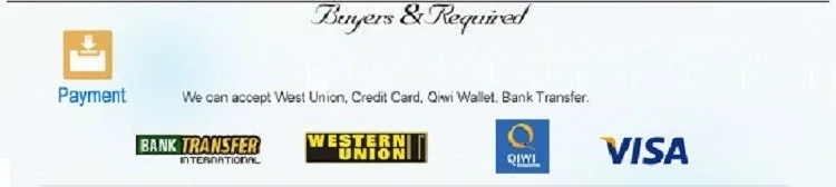 1. Мы принимаем Visa/MasterCard,MoneyBookers,WesternUnion,Банковский перевод, QiWi Кошелек иДругое.