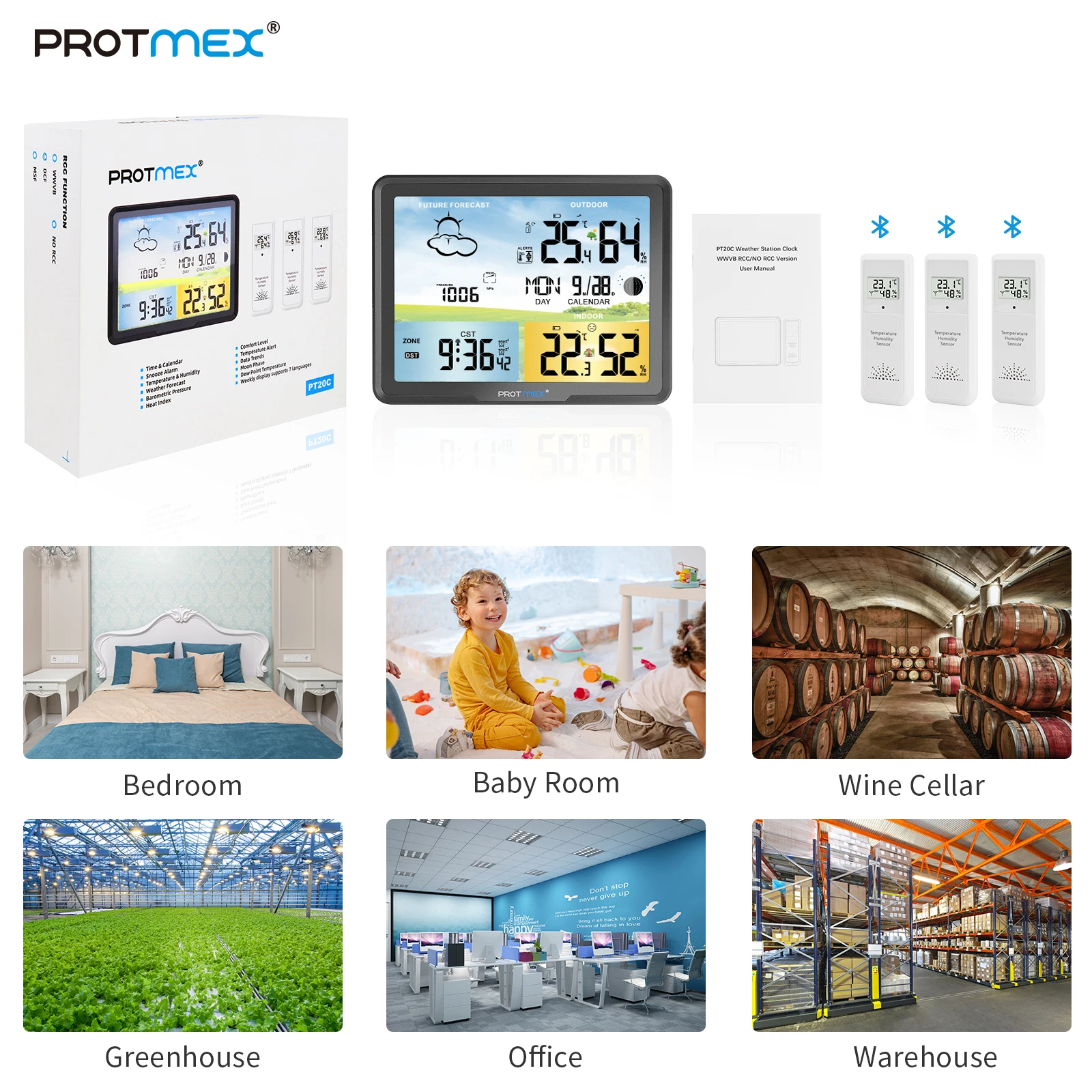 Protmex PT20 Многофункциональный цифровой Метеостанция Будильник. Имеет функции термометра, гигрометра и барометра, настройте беспроводной датчик. Эти данные могут быть использованы для предсказания погодных условий в будущем. Он не только позволяет узнать время и календарь, температуру точки росы и индекс тепла. Мороз и оповещение о температуре, выражение уровня комфорта в помещении, но и поможет вам в вашей жизни. Подходит для различных мест, будь то на столе или на стене. Простой и современный дизайн-отличный инструмент и домашний декор.
