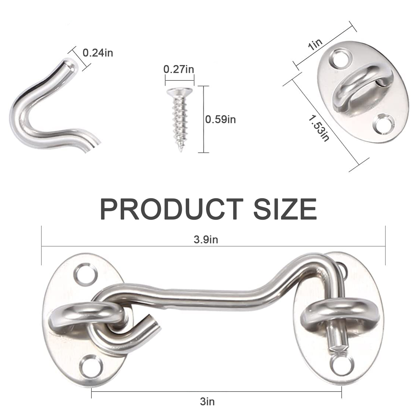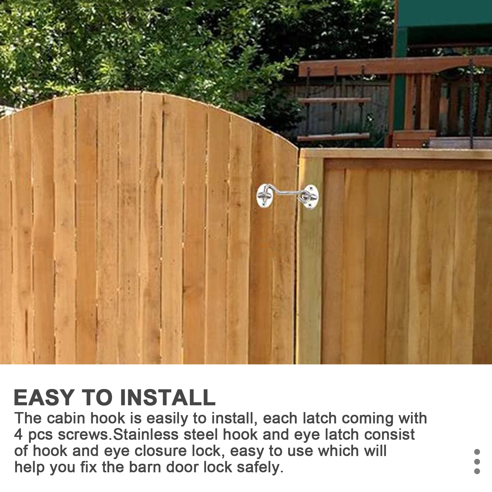 【Легко установить 】 крючок кабины легко установить, каждая защелка поставляется с 4 винтами. Крюк и защелка для глаз из нержавеющей стали состоят из крюка и закрывания глаз, которые просты в использовании, что поможет вам безопасно зафиксировать дверной замок сарая.