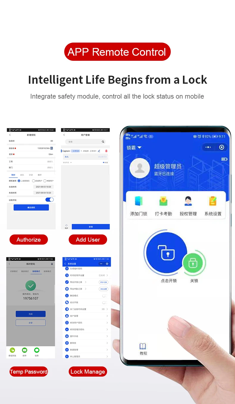 1. Несколько способов разблокировки: разблокировка отпечатков пальцев, разблокировка карт, пароль, мобильный NFC, разблокировка Bluetooth/APP