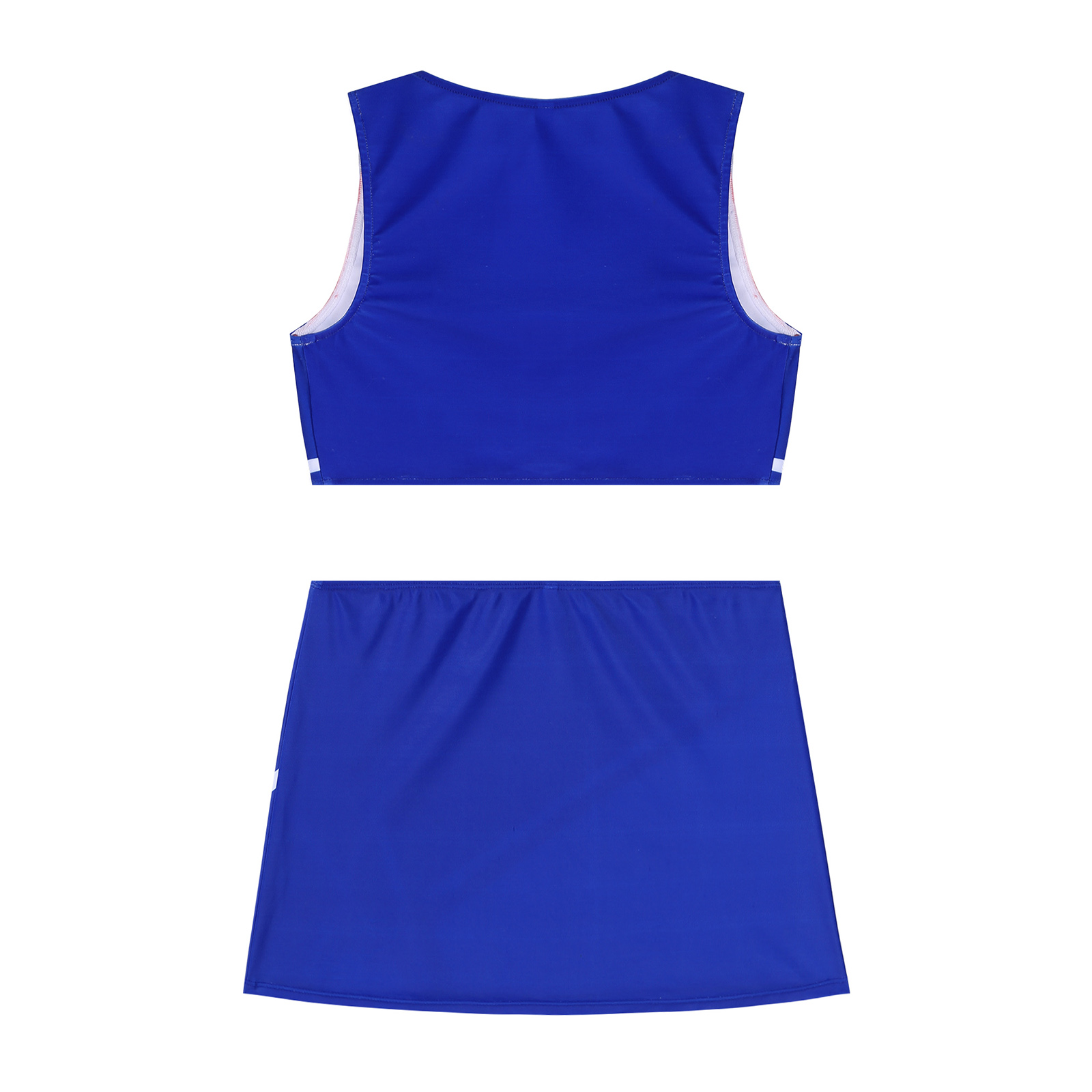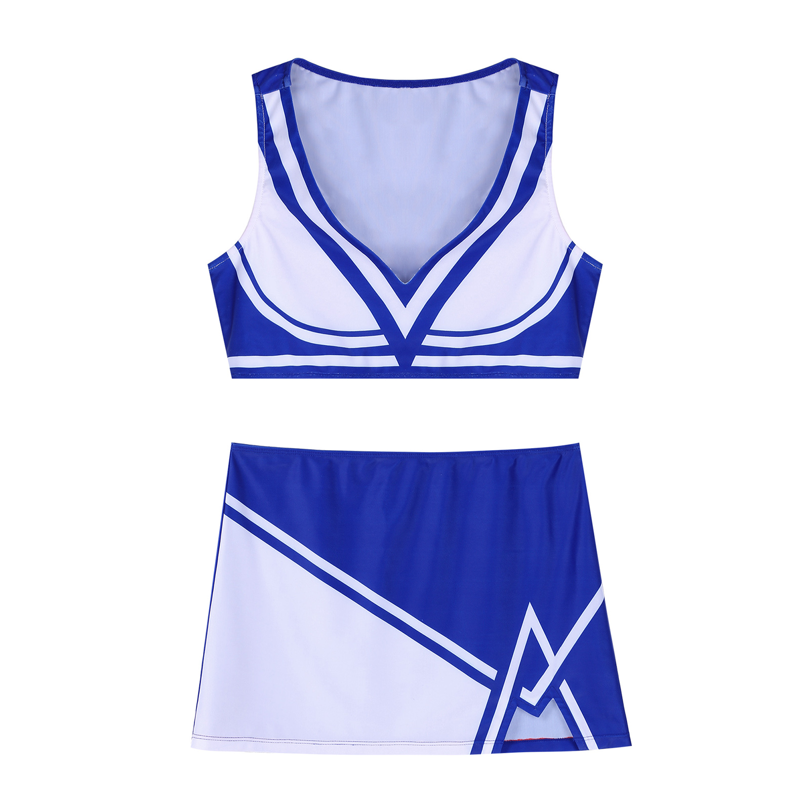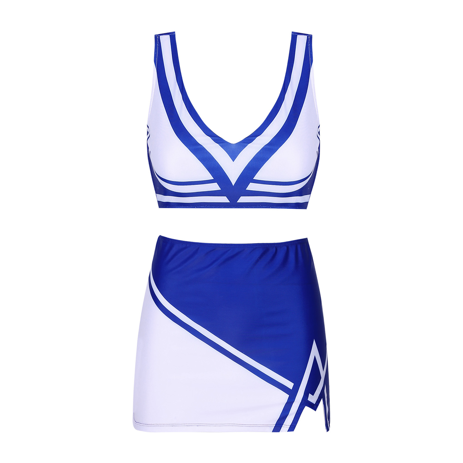 Комплект одежды Черлидинга включает топ без рукавов с буквенным принтом и v-образным вырезом и мини-юбку с разрезом по бокам.