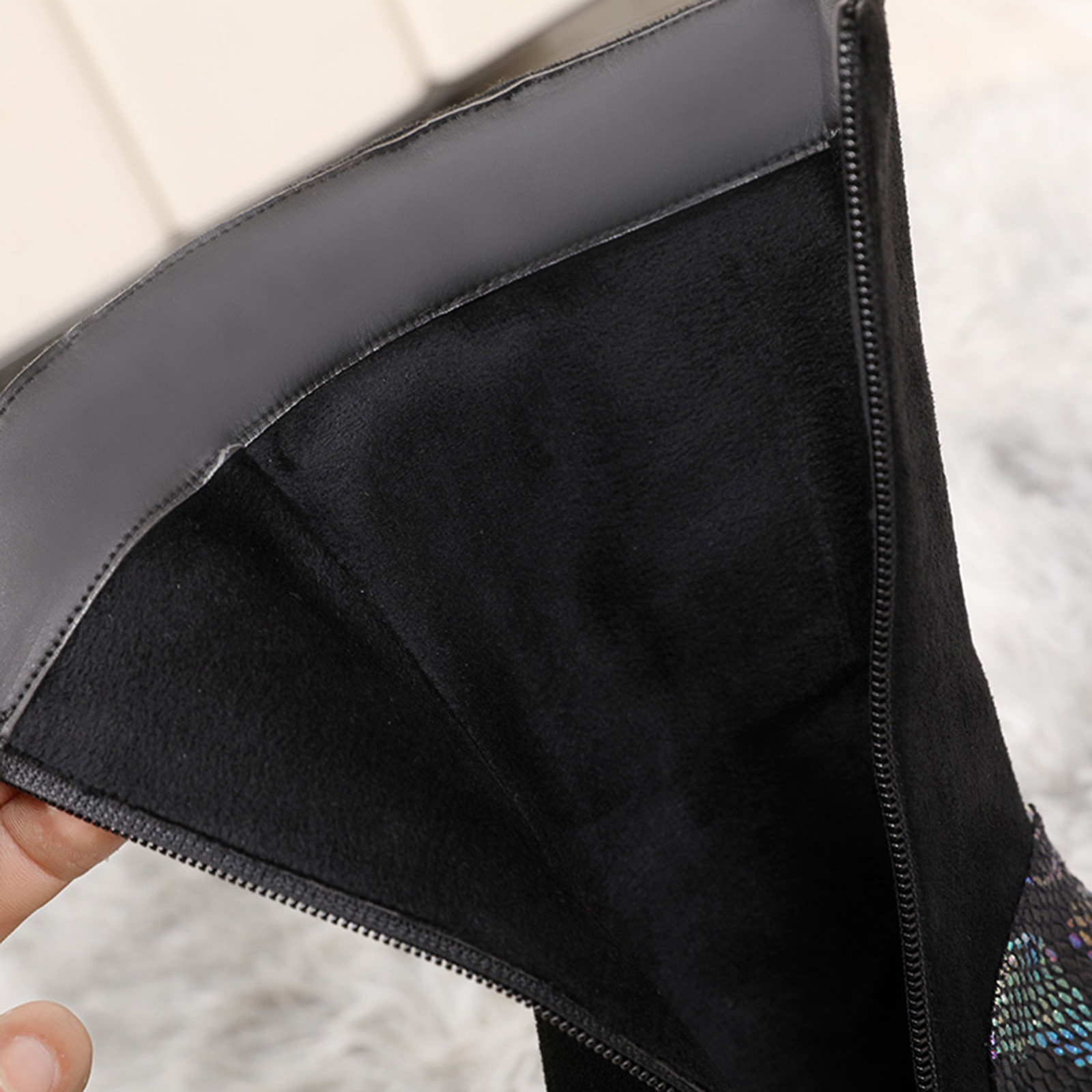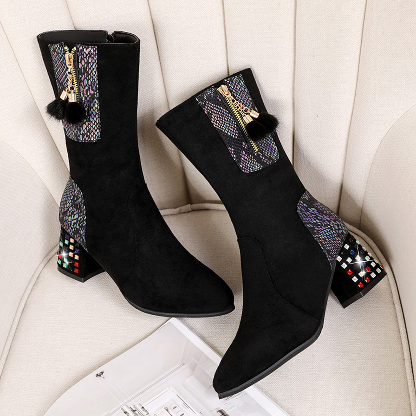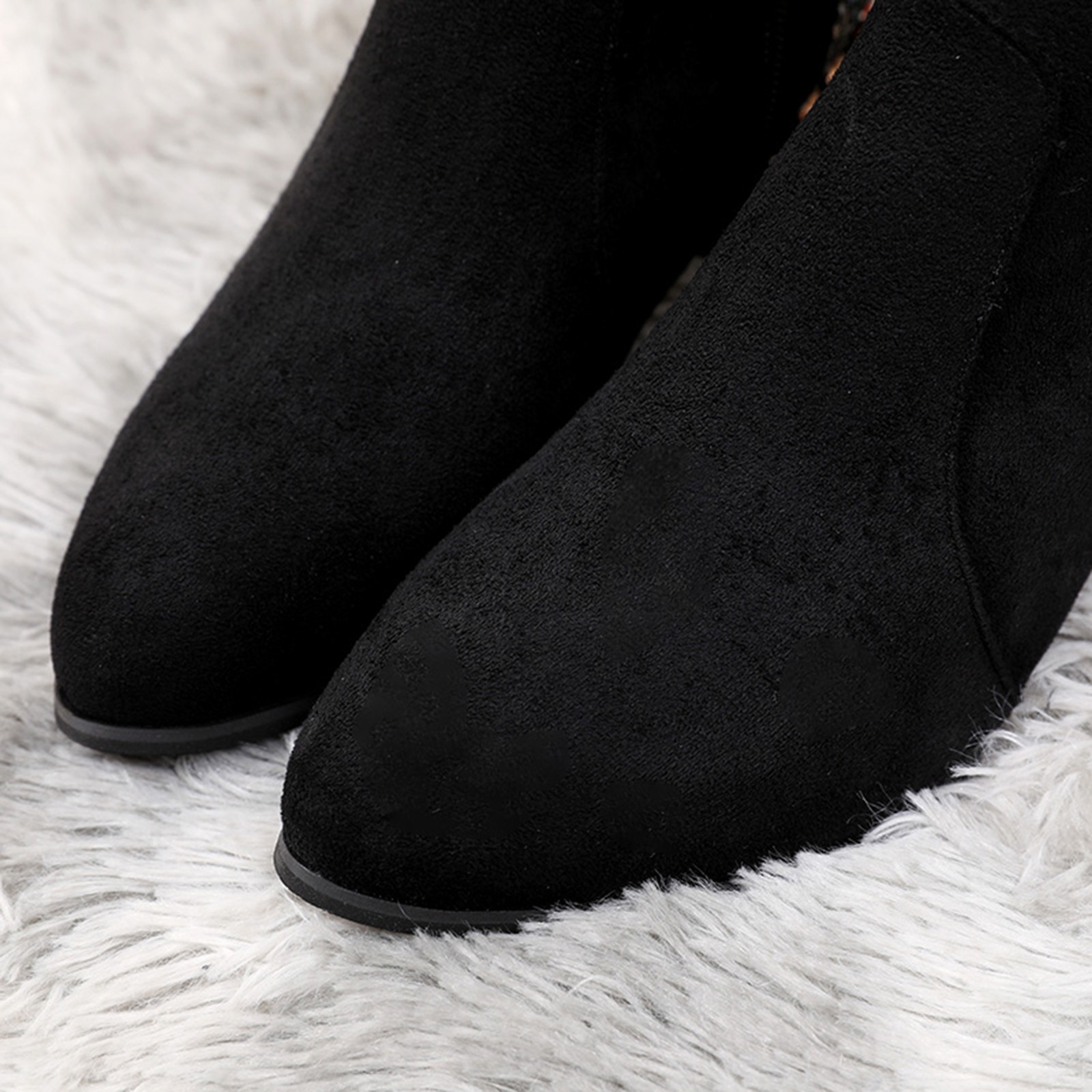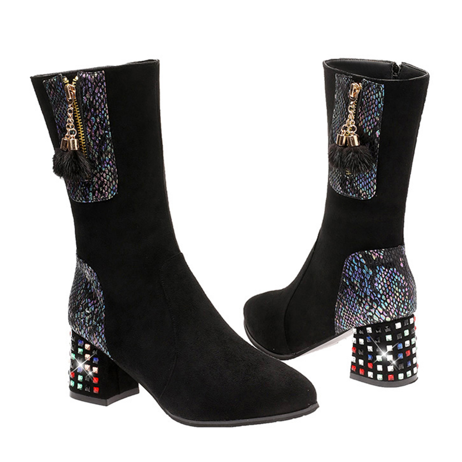 1. Женские ботфорты выше колена на толстом высоком квадратном каблуке и внутренней молнии для удобного надевания и снятия.