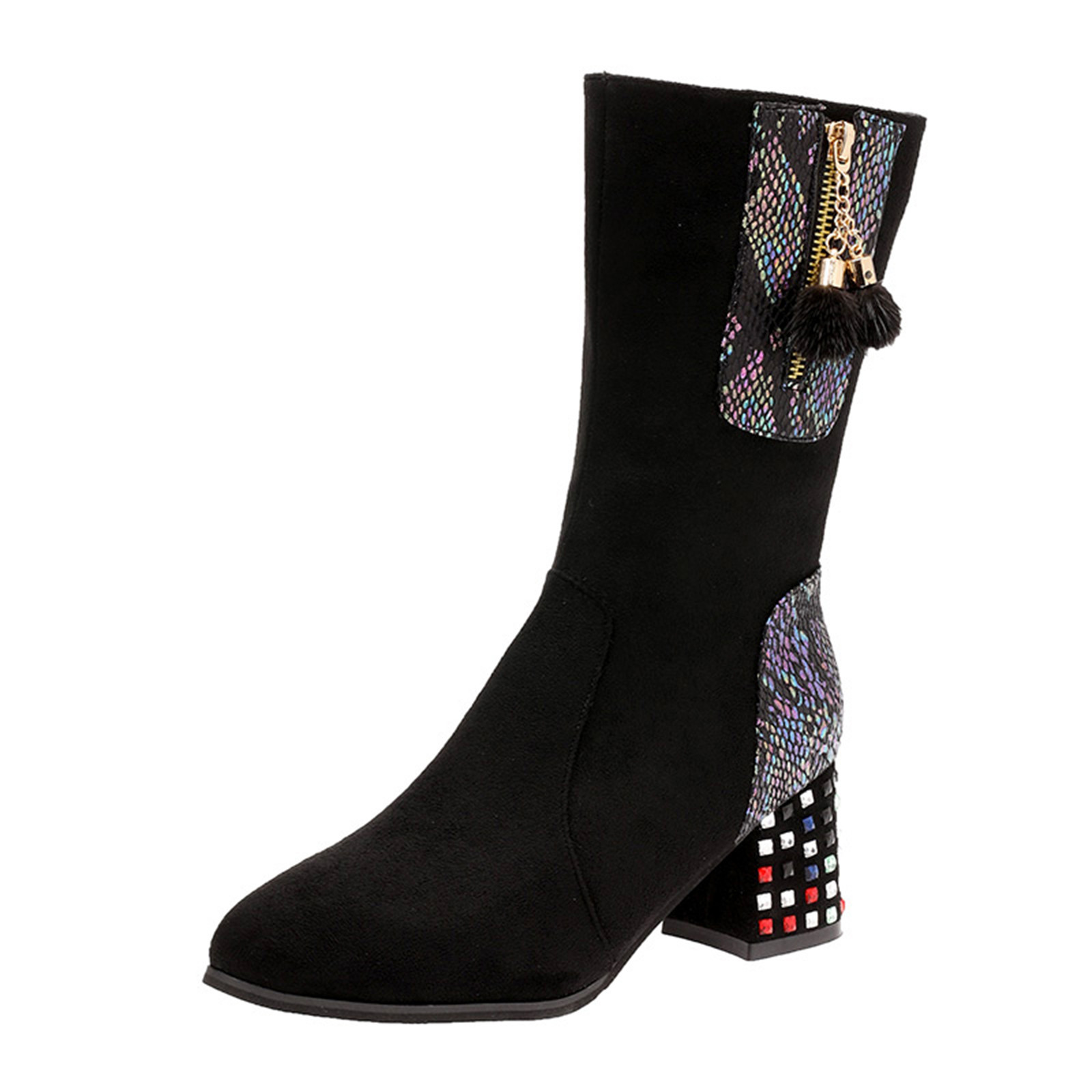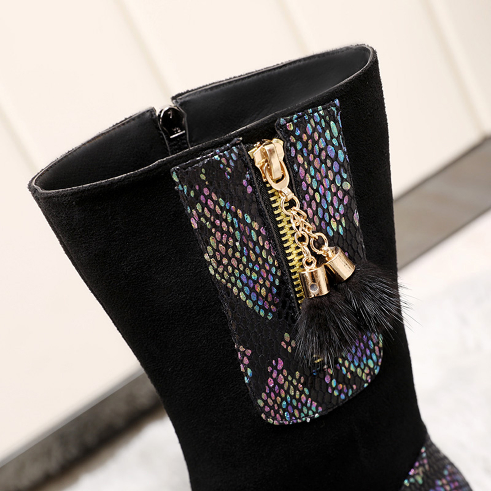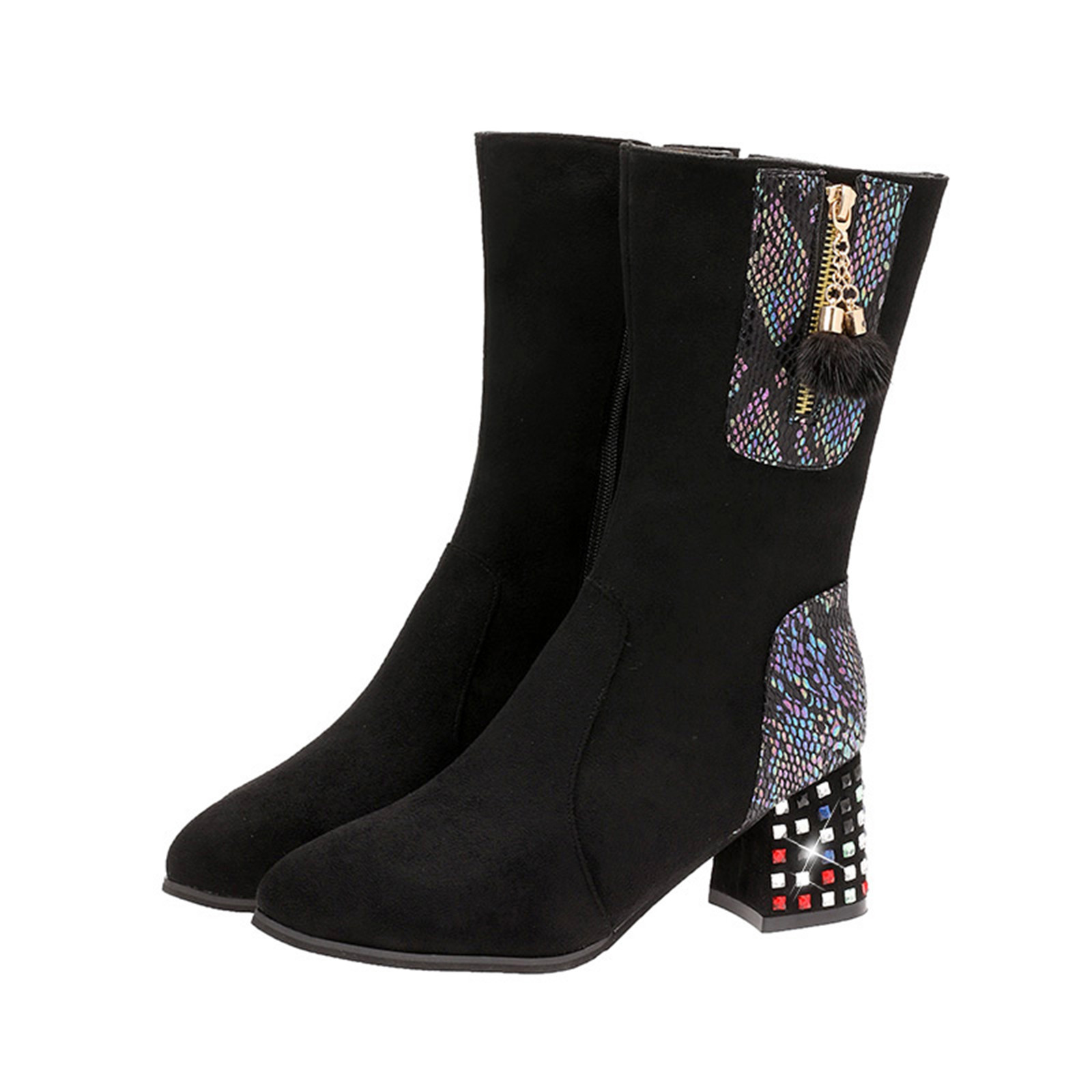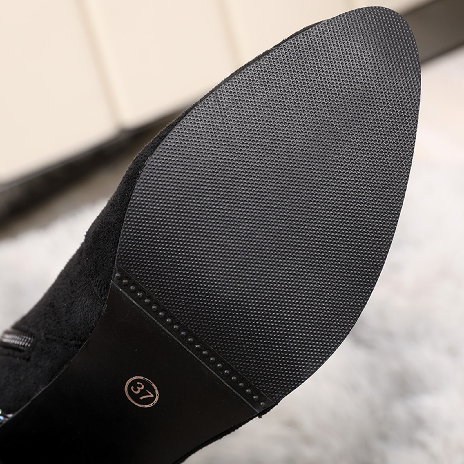 1. Женские ботфорты выше колена на толстом высоком квадратном каблуке и внутренней молнии для удобного надевания и снятия.