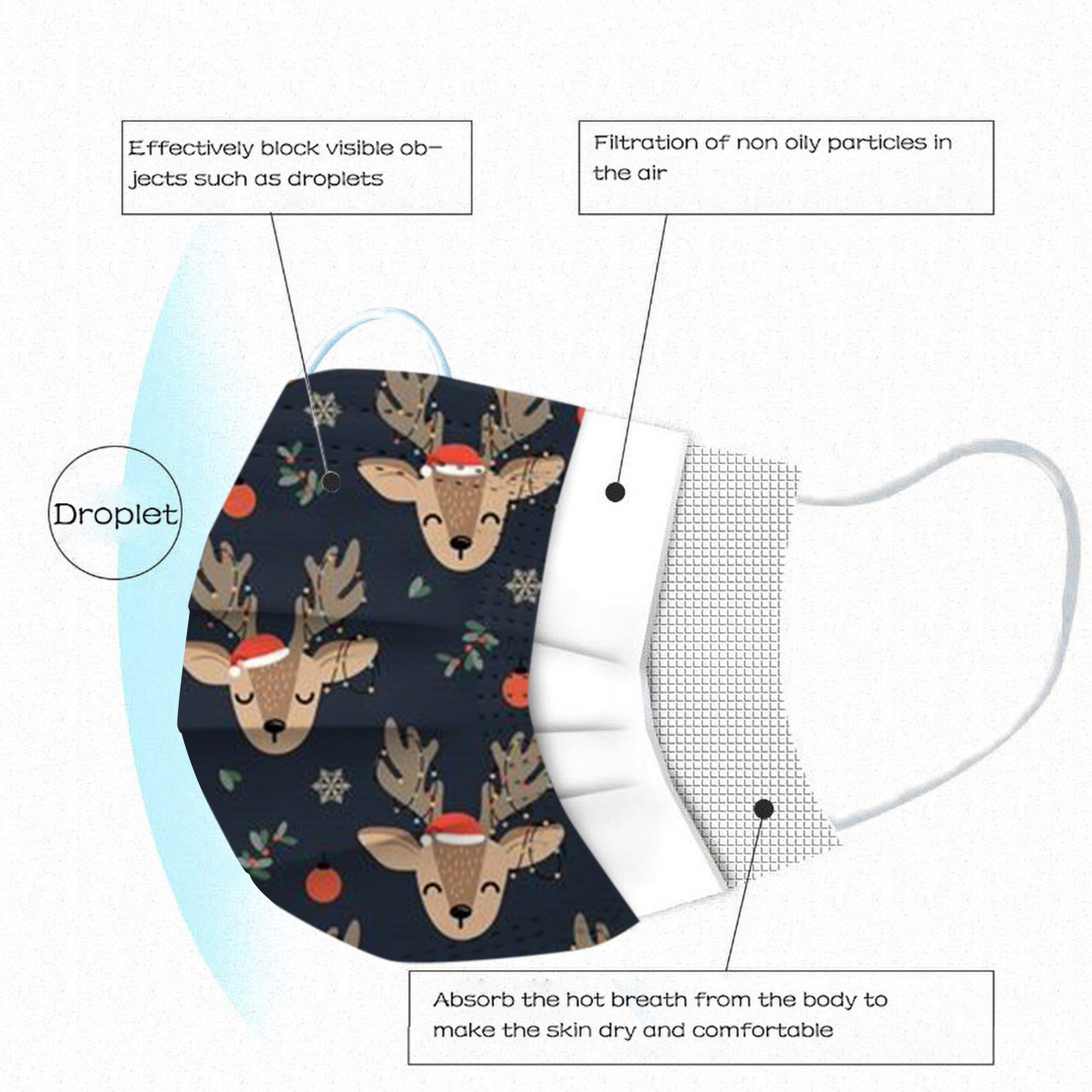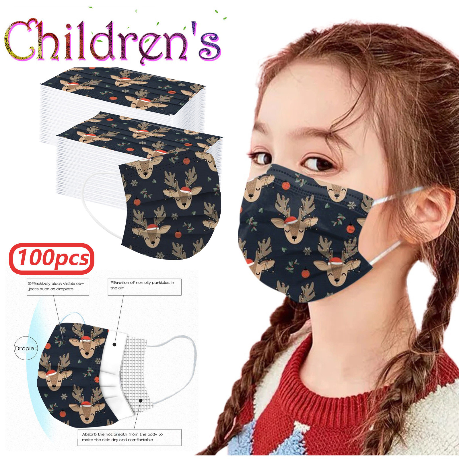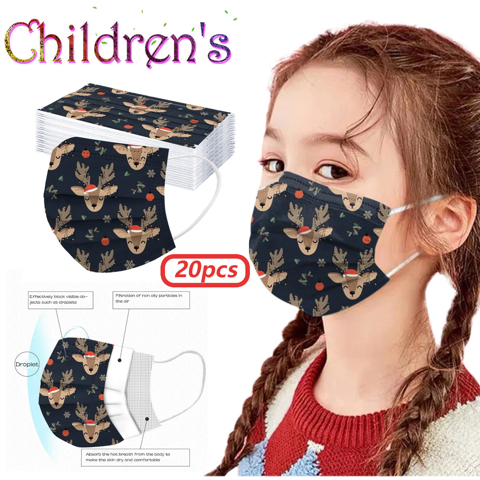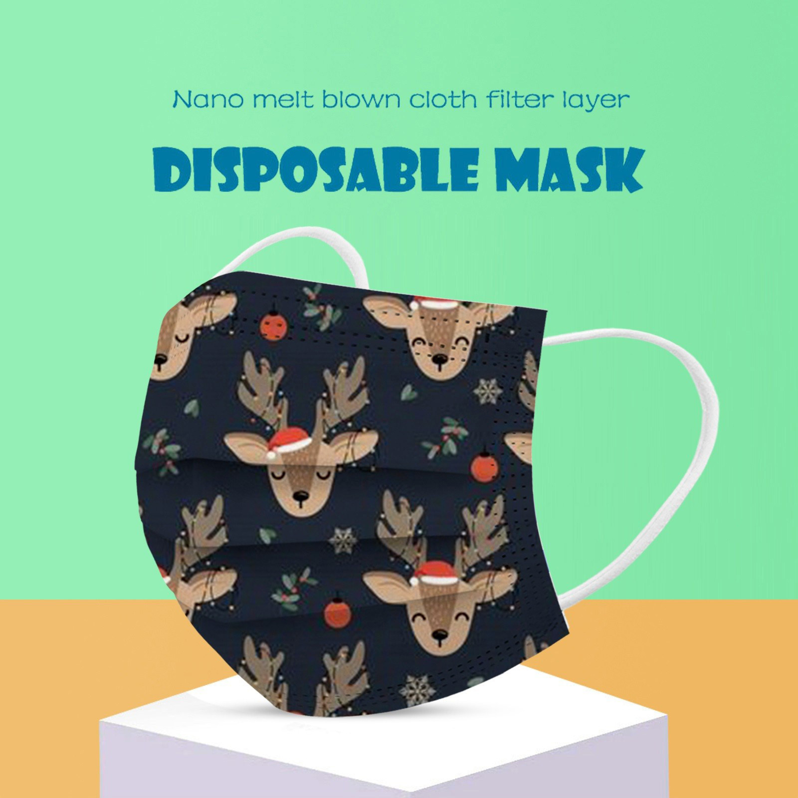 VERSATILE Christmas MASK: Christmas disposable activated carbon mask. Three layers, of protective filtration which includes non-woven fabric outside, Melt-blown fabric filter in the middle and soft non-woven fabric inside for comfort.Also perfect daily wear in a'llergy season.The perfect Christmas gift for your family and friends. BREATH EASILY: This Christmas disposable mask with design is for general use, effectively blocks droplets and d'ust. Non-woven can wisk away moisture. Suitable for all face shapes,breathe smoothly without resistance. PERFECT DESIGN: Soft elastic and bendable nose bridge help the mask conform to the face. Comfortable elastic earloop, extra-soft ear loops eliminate pressure to the ears.Inner layer is made of soft facial tissue, no dye, gentle to the skin. QUALITY MATERIAL: Made of environmental friendly material, moisture-proof, n'on-t'oxic, non-irritating, soft and comfortable. Novelty Halloween elements and colors, which will create a mysterious atmosphere. It protects you while making you look very stylish and temperament. OCCASSIONS: Novelty Christmas mask is perfect for any occassions. Not only weddings, bridal showers, communion, girl’s ladies night out, parties, professional work event, office, evening wear also perfect for Christmas Gifts, Costume Parties, Carnivals.Product description