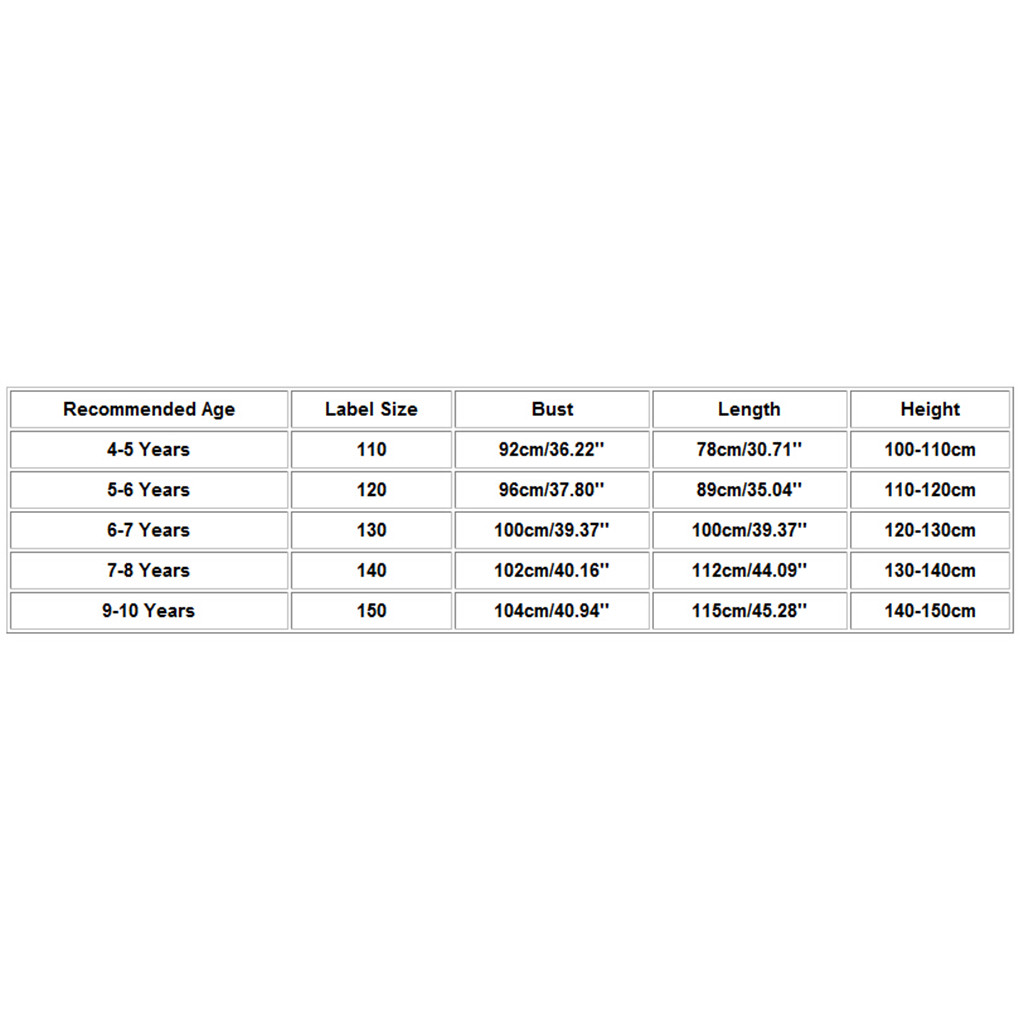 Рекомендуемый возраст Размер этикетки Бюст Рукав Длина Высота От 4 до 5 лет 110 92 см/36,22'' 29 см/11,42'' 78 см/30,71'' 100-110 см От 5 до 6 лет 120 96 см/37,80'' 30 см/11,81'' 89 см/35,04'' 110-120 см От 6 до 7 лет 130 100 см/39,37'' 31 см/12,20'' 100 см/39,37'' 120-130 см От 7 до 8 лет 140 102 см/40,16'' 32 см/12,60'' 112 см/44,09'' 130-140 см От 9 до 10 лет 150 104 см/40,94'' 33 см/12,99'' 115 см/45,28'' 140-150 смЕщё в начале декабря заказывали ребенку игрушку миксер инженерный грузовик,пришел только вчера. Получилось как раз под новый год, подарок ребенку.... Читать отзыв полностью...
