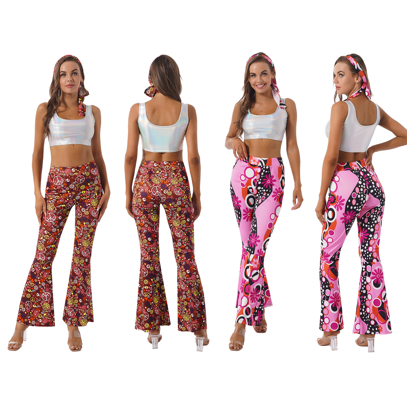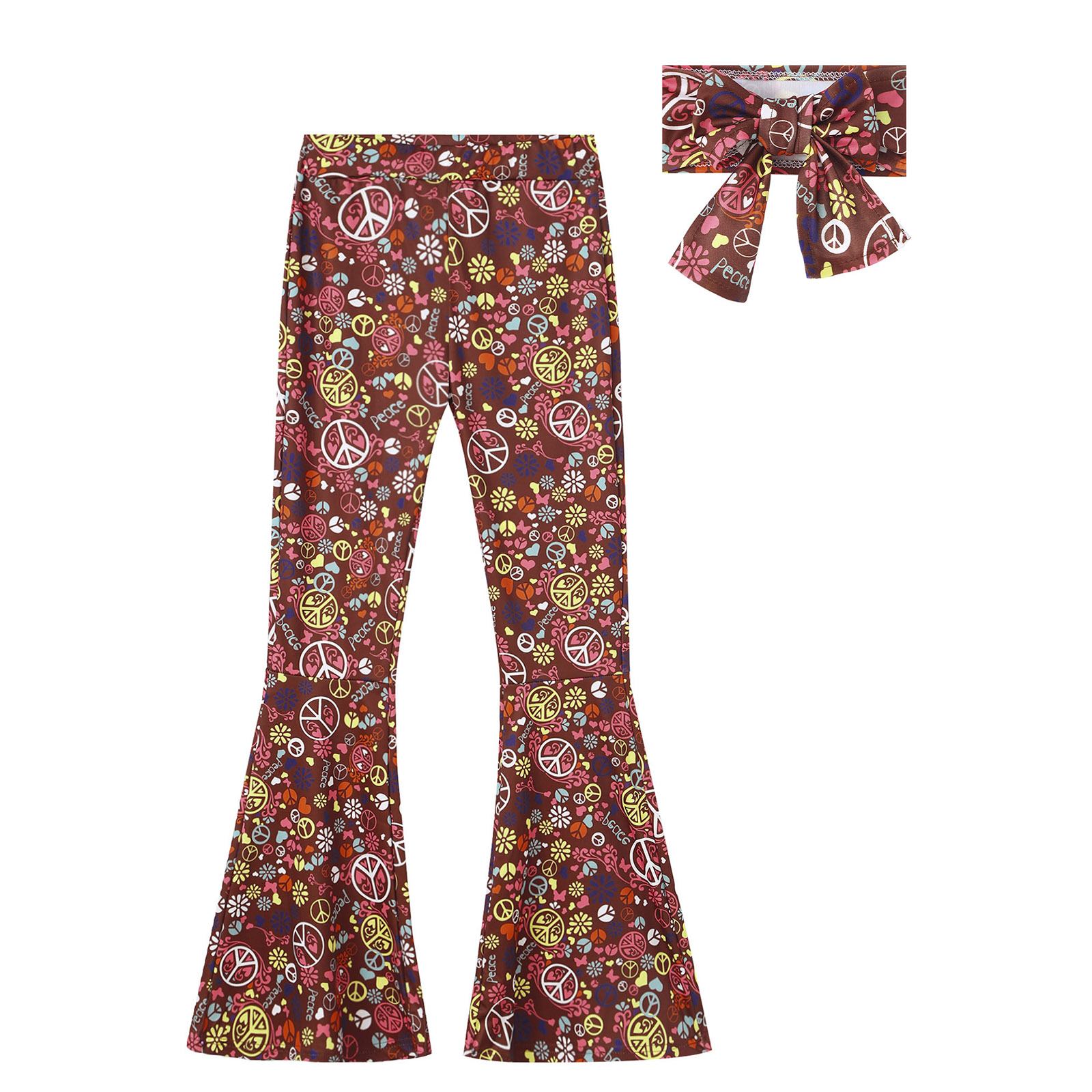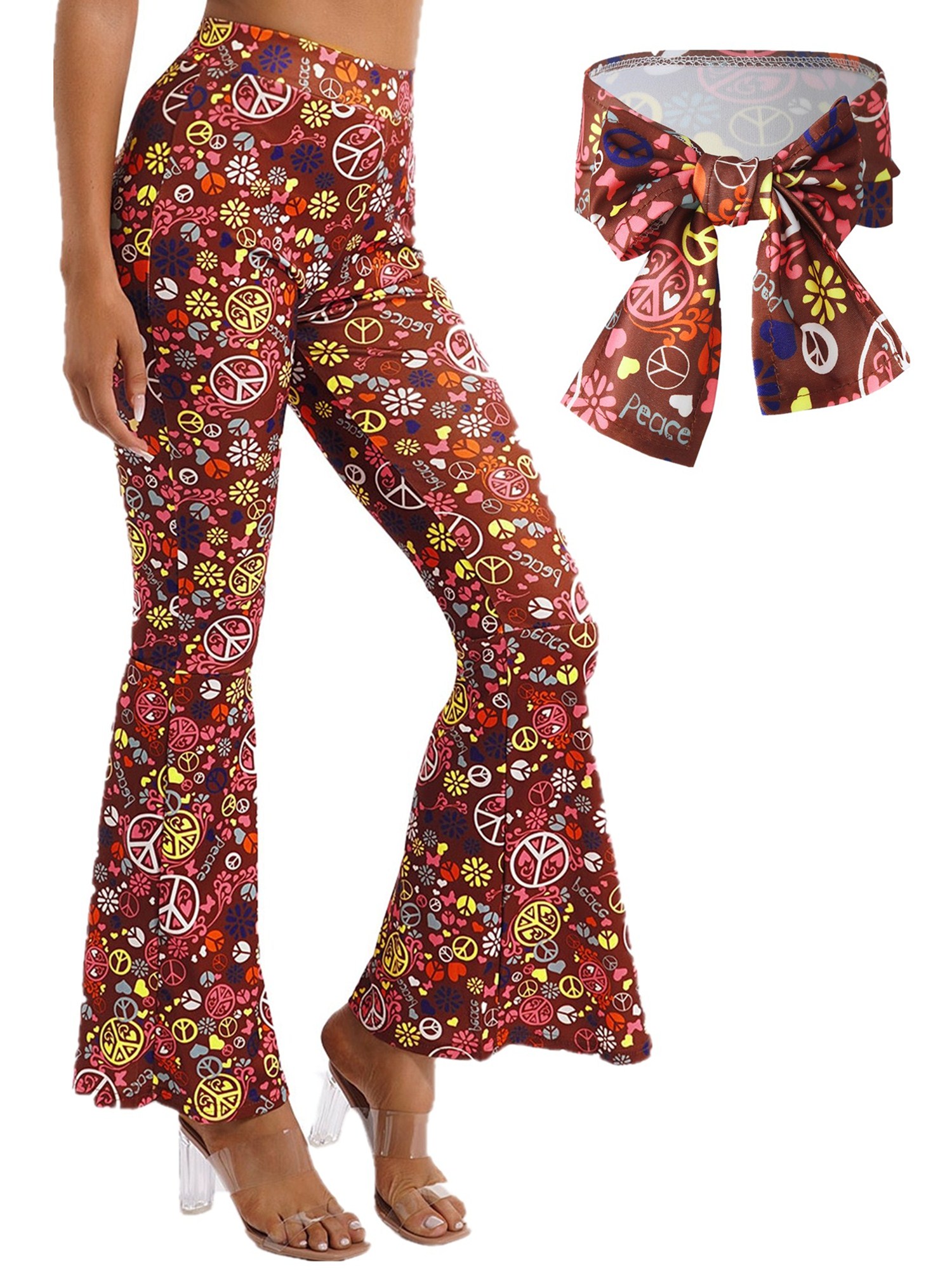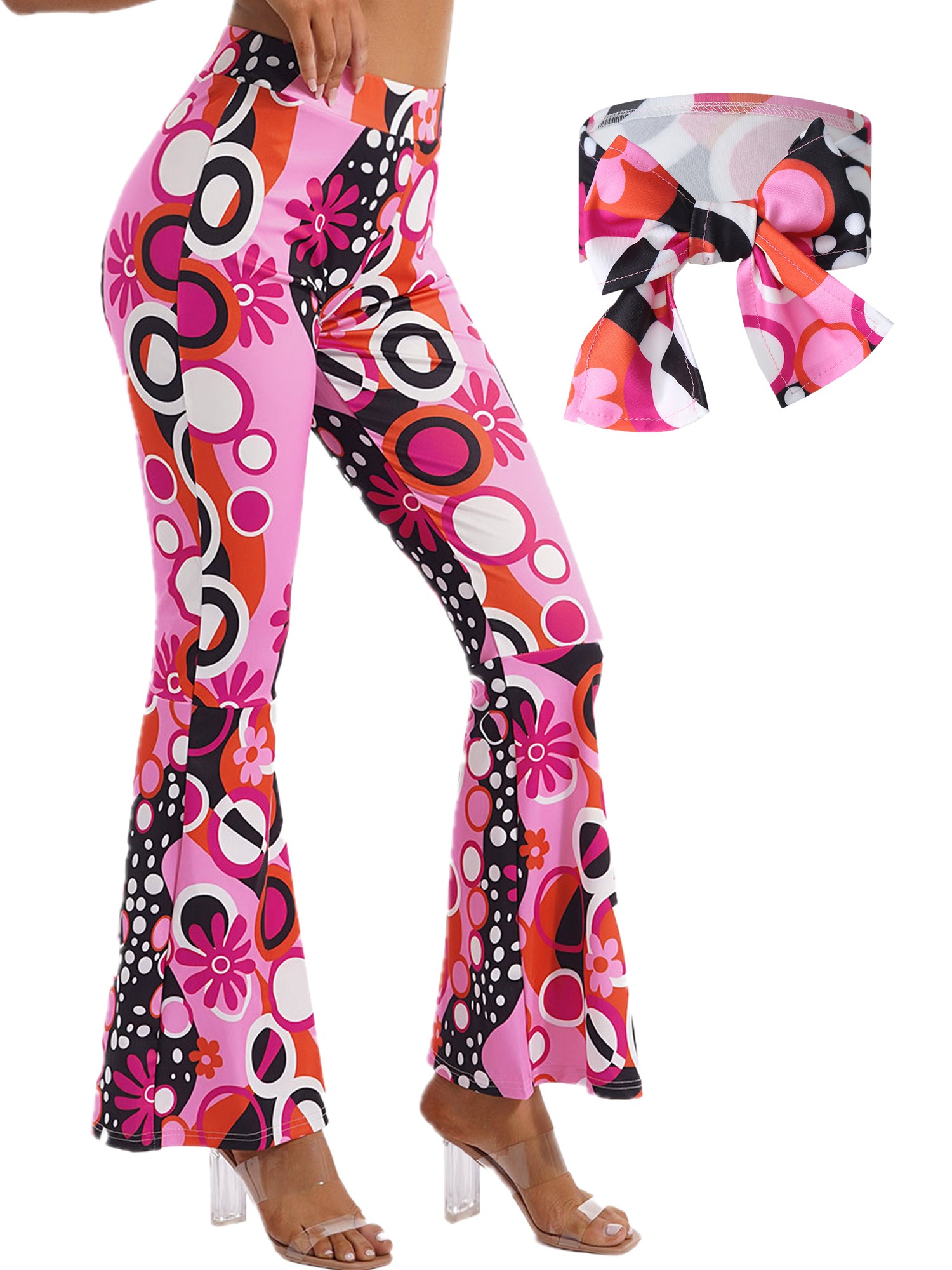 Женские Модные расклешенные брюки с цветочным принтом; Повседневные брюки со средней талией и колокольчиком с повязкой на голову.
