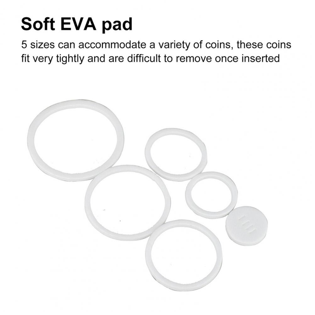 Он обеспечивает 5 размеров мягких подушечек EVA, чтобы соответствовать многим типы монеток. Эти монеты очень плотно сидят и их трудно удалить после вставки.