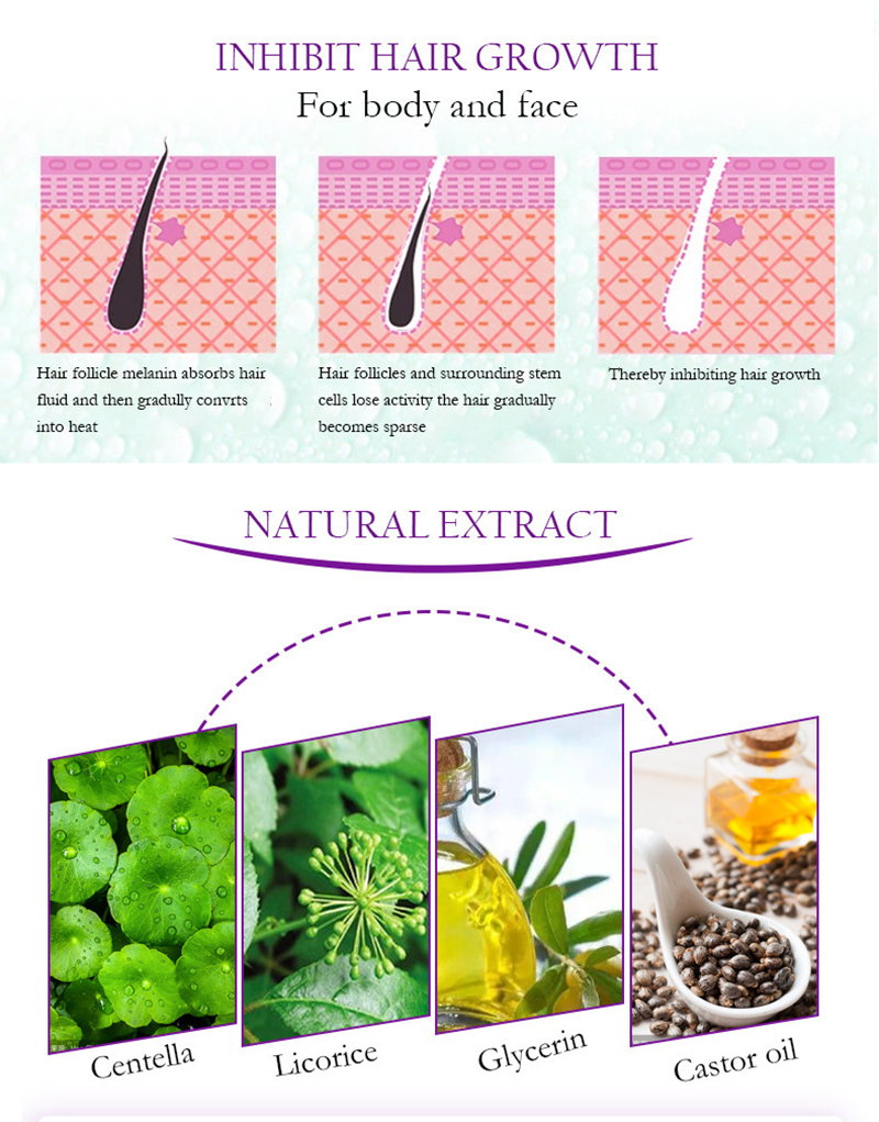 Функция: быстро смягчает корень контакта между волосами и волосами, эффективно подавляет рост волос в порах и имеет двойную функцию подавления волос и ухода за кожей, делая кожу гладкой, гладкая и эластичная.