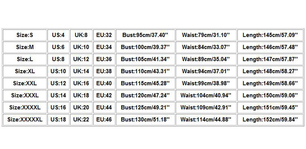 Размеры США Великобритания ЕС Бюст Талия Длина S 4 8 32 95 см/37,40'' 79 см/31,10'' 145 см/57,09'' М 6 10 34 100 см/39,37'' 84 см/33,07'' 146 см/57,48'' L 8 12 36 105 см/41,34'' 89 см/35,04'' 147 см/57,87'' XL 10 14 38 110 см/43,31'' 94 см/37,01'' 148 см/58,27'' XXL 12 16 40 115 см/45,28'' 99 см/38,98'' 149 см/58,66'' XХХL 14 18 42 120 см/47,24'' 104 см/40,94'' 150 см/59,06'' XXXXL 16 20 44 125 см/49,21'' 109 см/42,91'' 151 см/59,45'' XXXXXL 18 22 46 130 см/51,18'' 114 см/44,88'' 152 см/59,84''