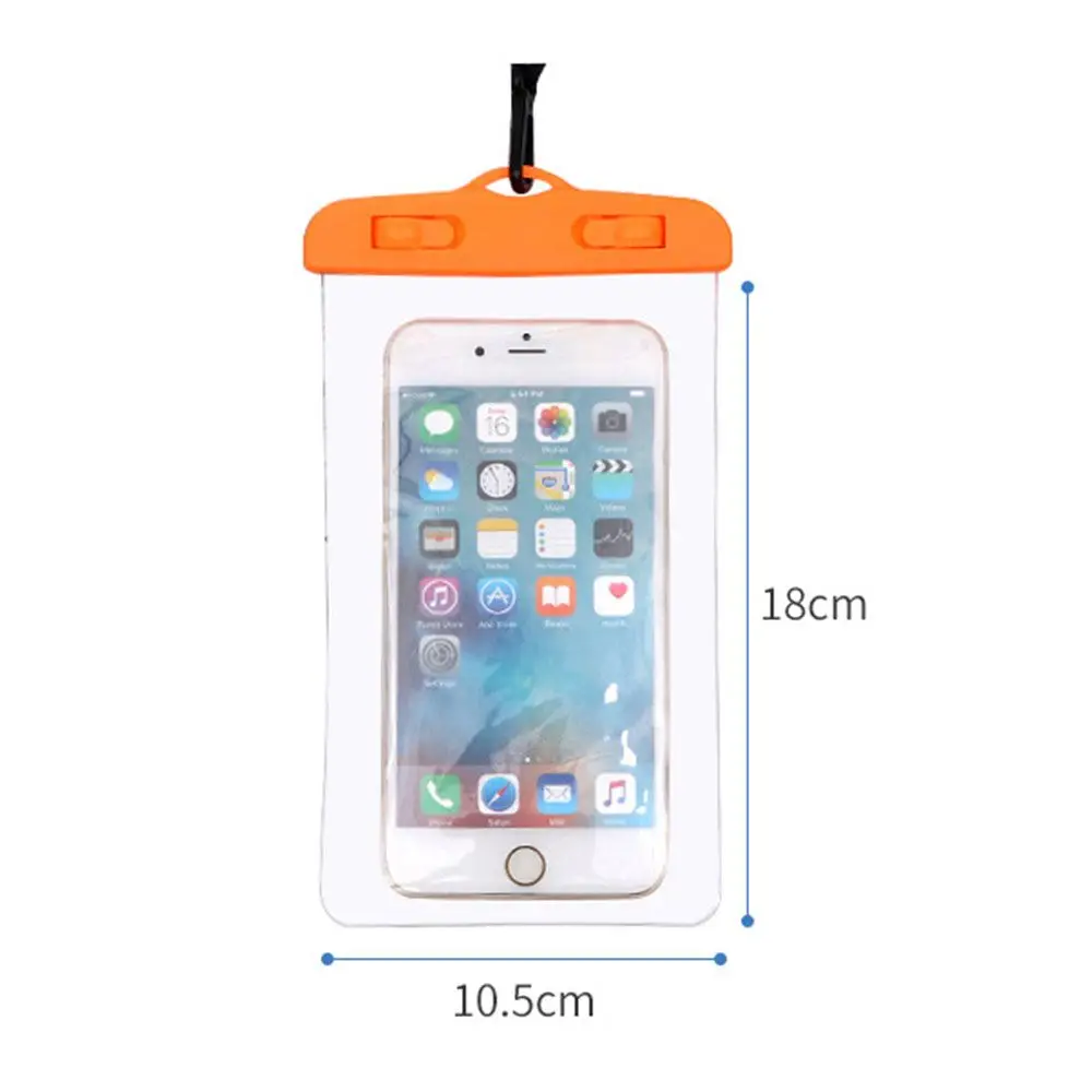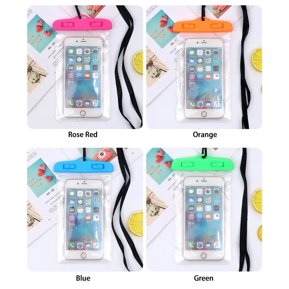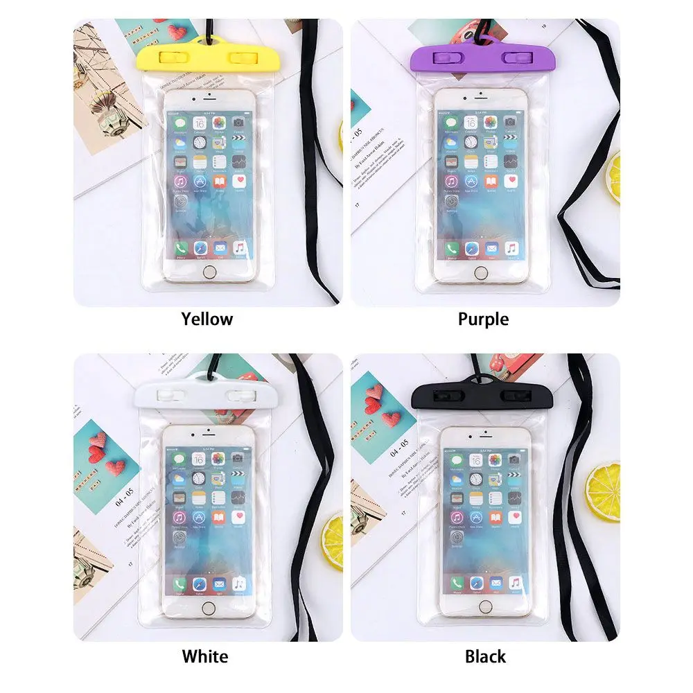 Материал: ПВХ + АБС Вес: прибл. 36 г Цвет: белый, желтый, фиолетовый, зеленый, синий, черный, розовый, оранжевый Размер: 10,5х18 см Совместимость: 5,2 ~ 6,4 дюймовый мобильный телефон Посылка включает в себя: водонепроницаемый мешок * 1, ремешок * 1, руководство * 1