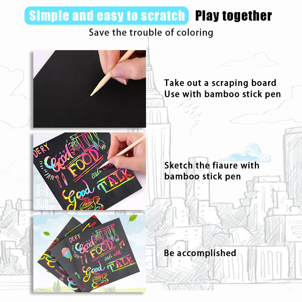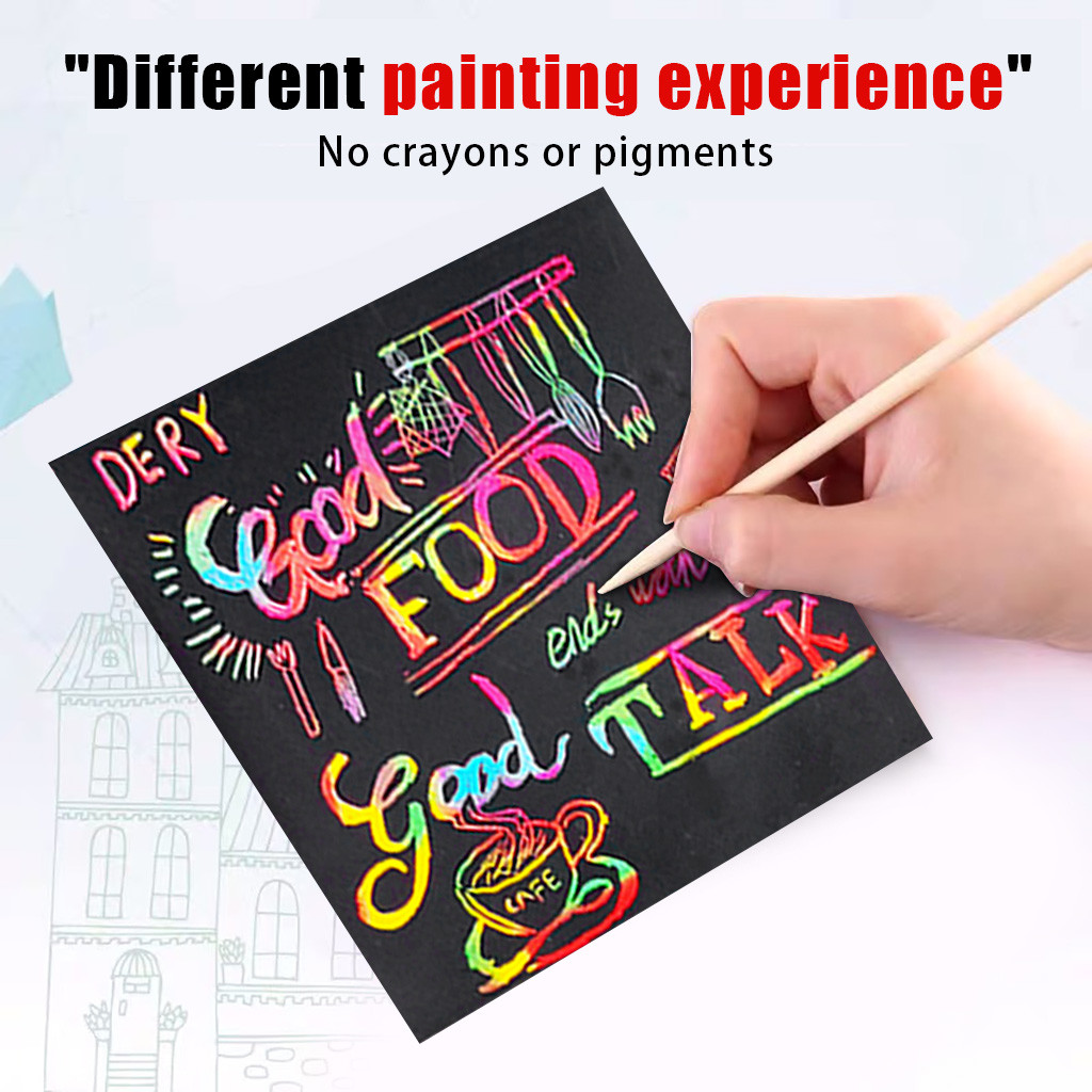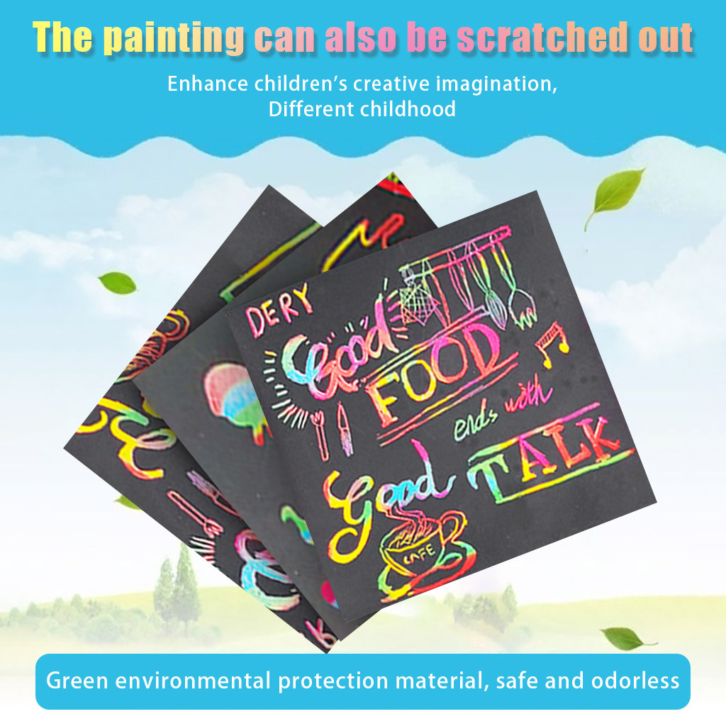 Безопасный и нетоксичный, не отличается Вкус, нет токсичного порошка, поэтому каждый может занять время, чтобы играть, думать, тестировать И готовьтесь к своим шедеврам, наслаждайтесь искусством царапин.