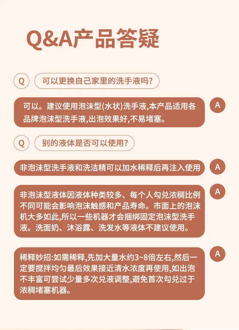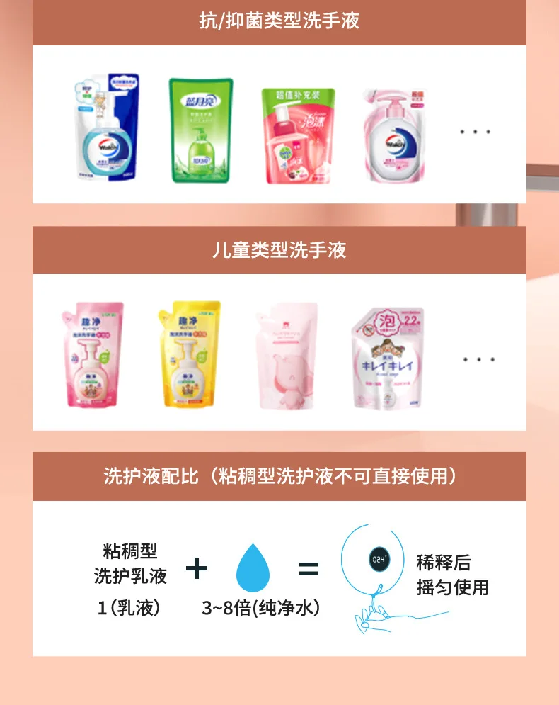 【Экономия ресурсов, экономия денег-Автоматический дозатор мыла может работать со всеми видами обычного моющего средства, мыла для посуды, гелей для ванны, лосьона, шампуня, который, по крайней мере, сохраняет мыло до 50%, это означает, что экономит природный ресурс и деньги. Для лучшего качества рекомендуется разбавить жидкость и воду в соотношении 1:3-8.