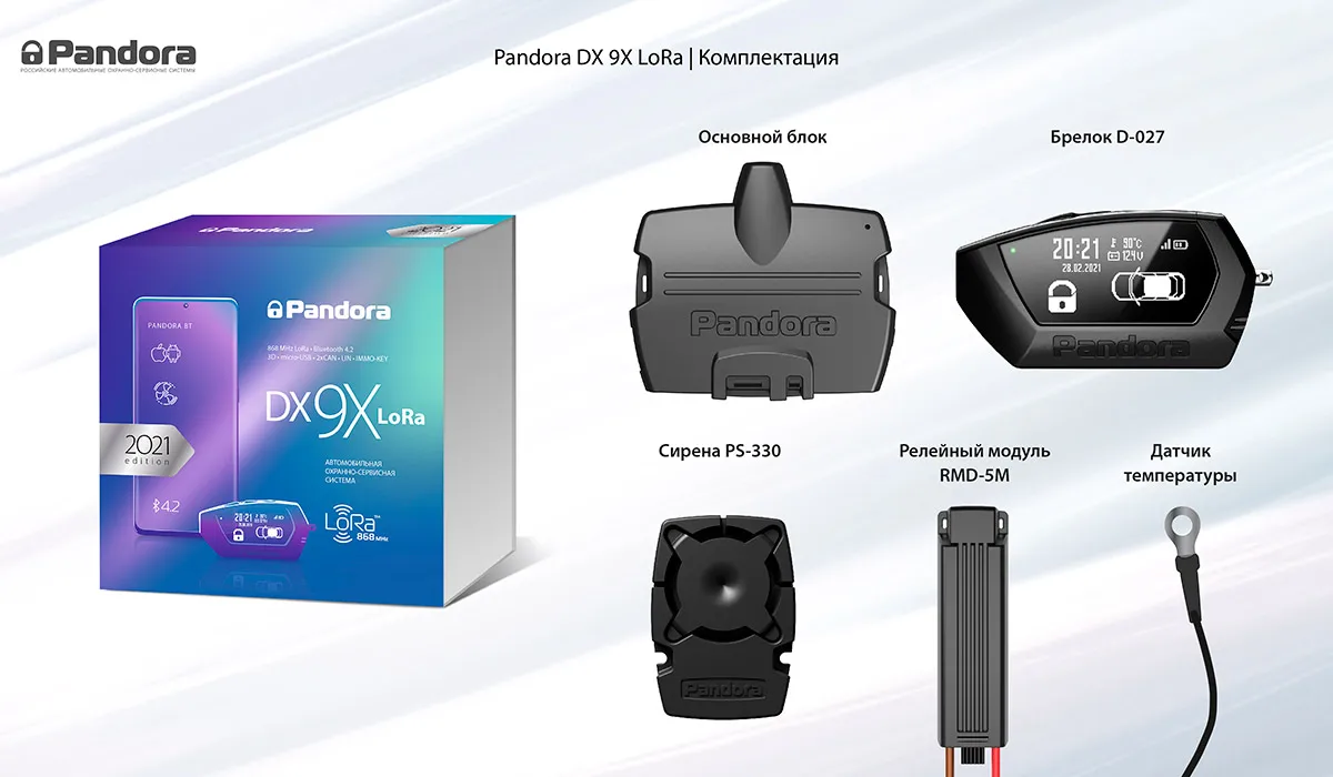 Автосигнализация Pandora DX-9x LoRa оснащена функцией автозапуска, Bluetooth-интерфейсом и LoRa-модуляцией. В ее комплект входит новый брелок D-027 с OLED-дисплеем, на котором отображается вся актуальная информация об автомобиле. Весь функционал брелока доступен также в мобильном приложении Pandora для iOS и Android — таким образом, на дистанции до 50 м можно использовать вместо брелока свой смартфон, поддерживающий Bluetooth 4.2 и выше.