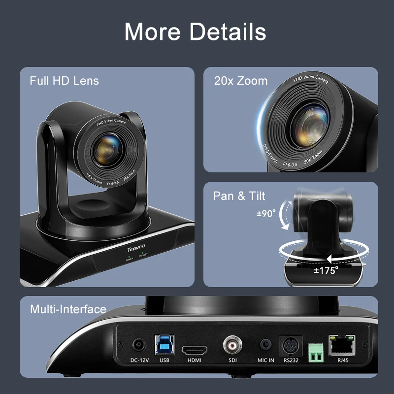 О: есть RS232, RS485 PTZ контроль, а также поддержка VISCA, PELCO-P, PELCO-D для управления через ваш кодек или ПК через RS232, и поддержка ИК-пульта дистанционного управления.