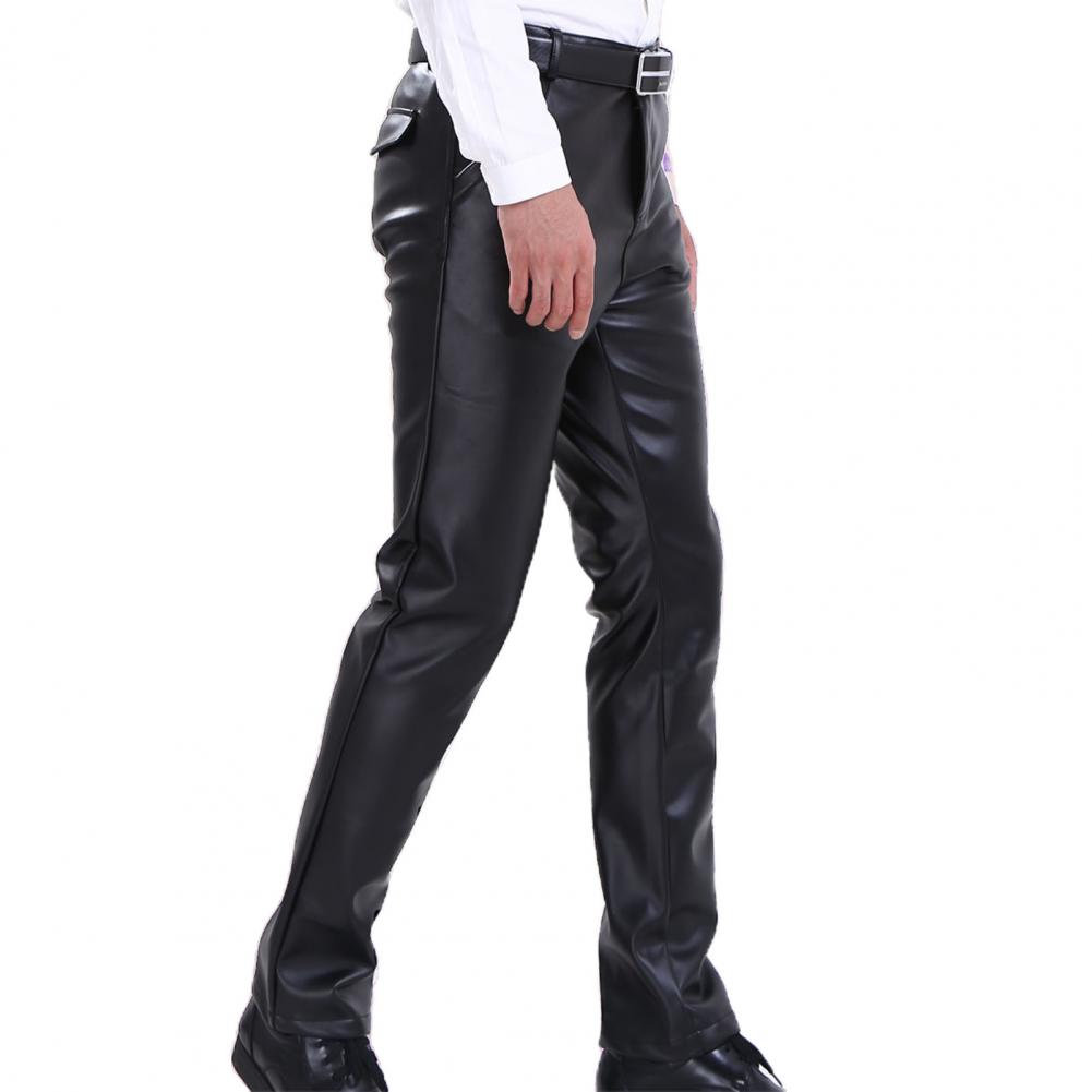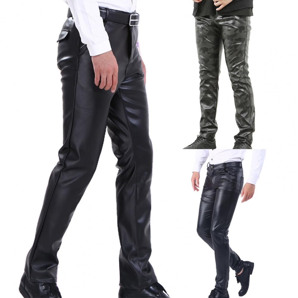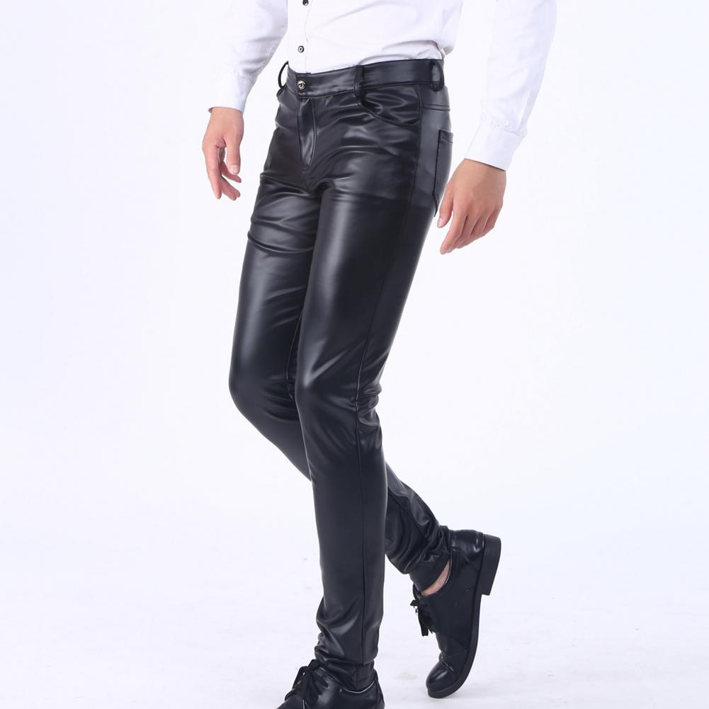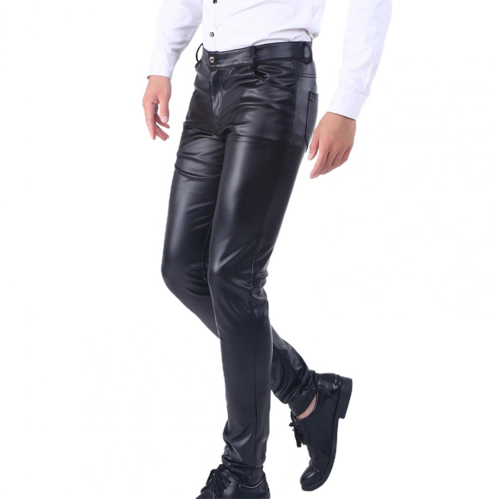 Men Pencil Trousers Plush Waterproof Slim Faux Leather Winter Leather Pants for Nightclub