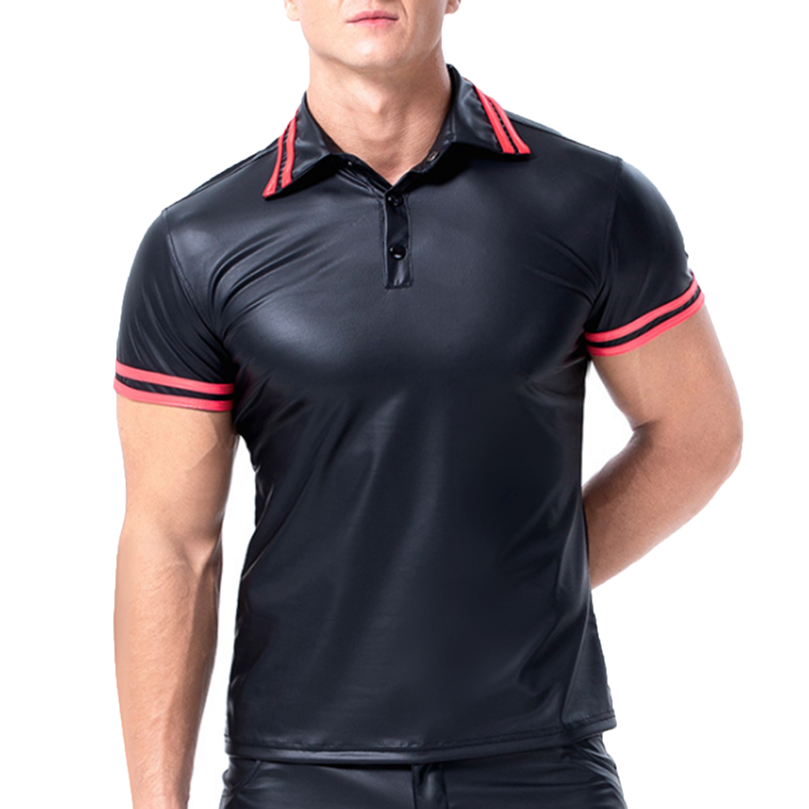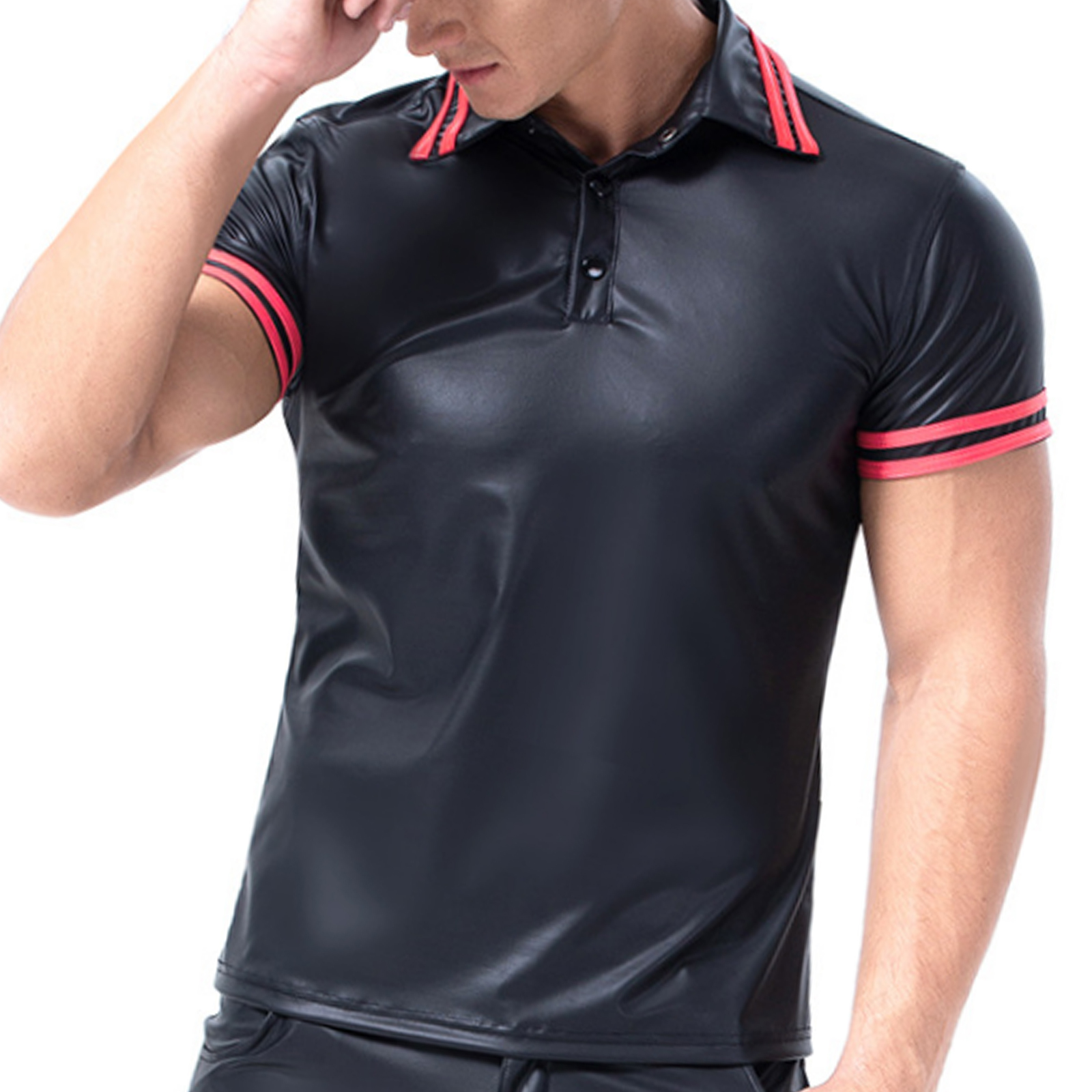 Мужская футболка из искусственной кожи с коротким рукавом и отложным воротником, облегающие топы, Клубная одежда.