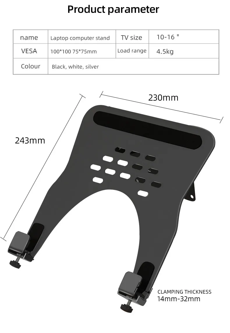 Модель: XY360 (Содержит только 1 лоток для ноутбука, нет подставки для монитора и руки)Размер ноутбука: 10-16"Грузоподъемность: 4,5 кгМакс. VESA: 75*75/100*100 ммМодель: H11- XY360 (двойной экран)