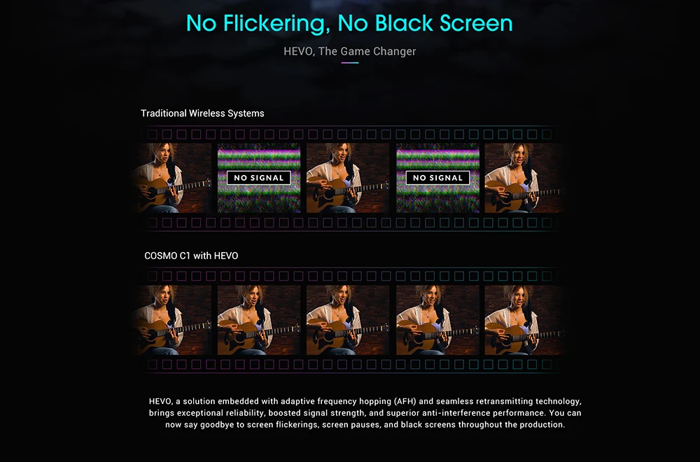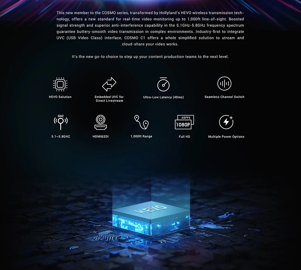 Революция беспроводной передачи видео. COSMO C1 оснащен технологией HEVO Hollyland с адаптивной частотой Hopping (AFH), бесшовной передачей и упрощенной потоковой передачей UVC, что обеспечивает повышенную прочность сигнала и превосходную производительность от помех. Быстрая, стабильная и умная передача видео с частотой 5 ГГц.