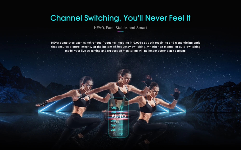 Незаметное переключение каналов. HEVO завершает каждую синхронную частоту прыжков в 0,001 s с только 40ms ультра-низкой задержкой и до 1,000ft линии зрения (LOS) диапазона. Будь то в ручном или автоматическом режиме переключения, ваш электронный полевой мониторинг больше не будет страдать от мерцания экрана или черных экранов в сложных беспроводных средах.