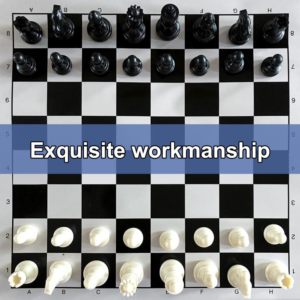 Изделие изготовлено из прочного материала PS. Шахматная доска имеет тонкую текстуру, хорошо сделанные шахматные фигуры, высокое качество изготовления, высокое качество и гладкое ощущение руки.