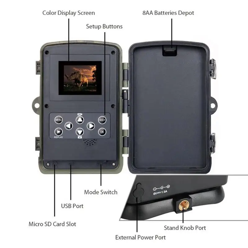Поддержка Micro SD карты/USB / AV выход (не включая sd-карту). -Отличный инструмент для охоты, путешествий, кемпинга, отслеживания домашних/диких животных. Простота в использовании и сборке. -Это может быть вызвано любым движением человека (или животного) в определенной области, контролируемой датчиком движения. -Дальний инфракрасный-это Входное устройство камеры, в основном используемое для настройки клиента. Максимальное расстояние дистанционного управления составляет 20 метров. -Фиксированная веревка с пряжкой, легко фиксируется на палках деревьев и ветках.