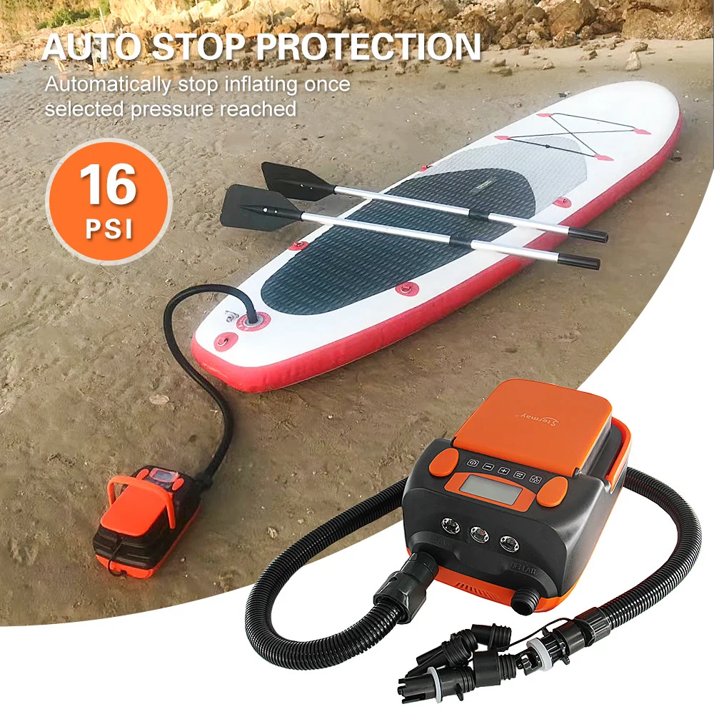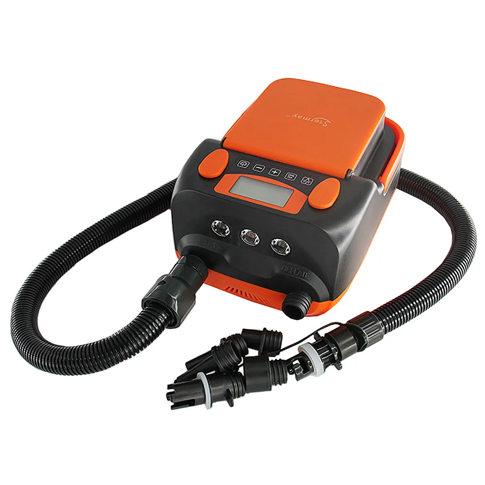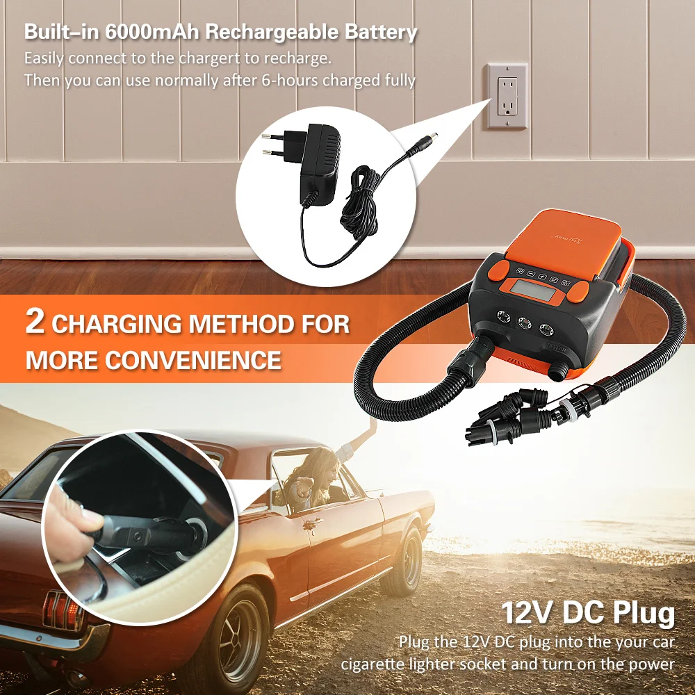 Интеллигентая (ый), работающего на постоянном токе 12 В в двух-этап автоматический Электрический насос оборудован с цифровым управлением и ЖК-дисплей, на котором может отображаться комплект сопло воздушного давления в режиме реального времени. Насос может автоматически останавливаться при установленном давлении воздуха. Легко надувать и сдувать, чтобы удовлетворить ваши потребности. 2 метод загрузки для увеличения комфорта. Оснащен 6 насадками, подходит для большинства воздушных подушек, Надувные лодки, палатки, гребные доски и т. д. не беспокойтесь о работе ночью, потому что 3 светодиодный свет яркий! Вы также можете зарядить свой мобильный телефон во время активного отдыха.