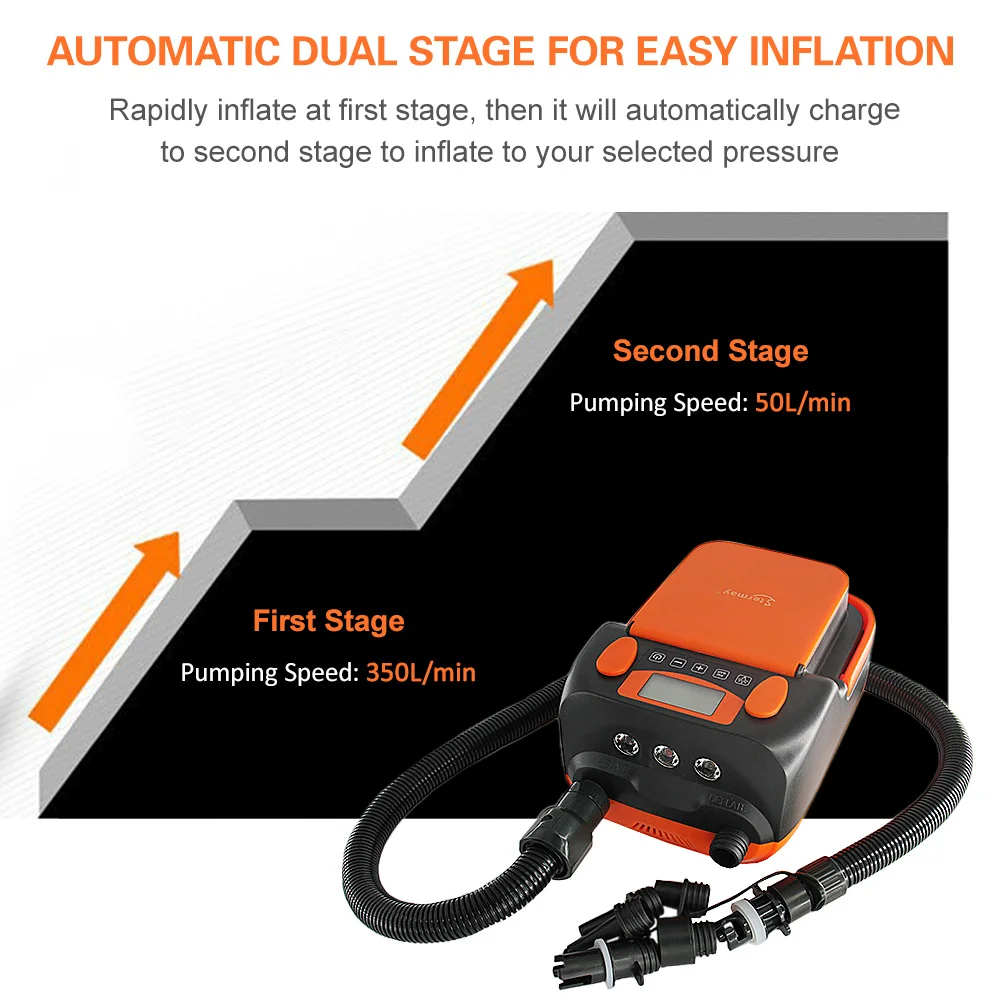 Автоматический двухступенчатый насос быстро надувается на первом этапе, а затем автоматически загружается на второй этап для надувания до выбранного давления.