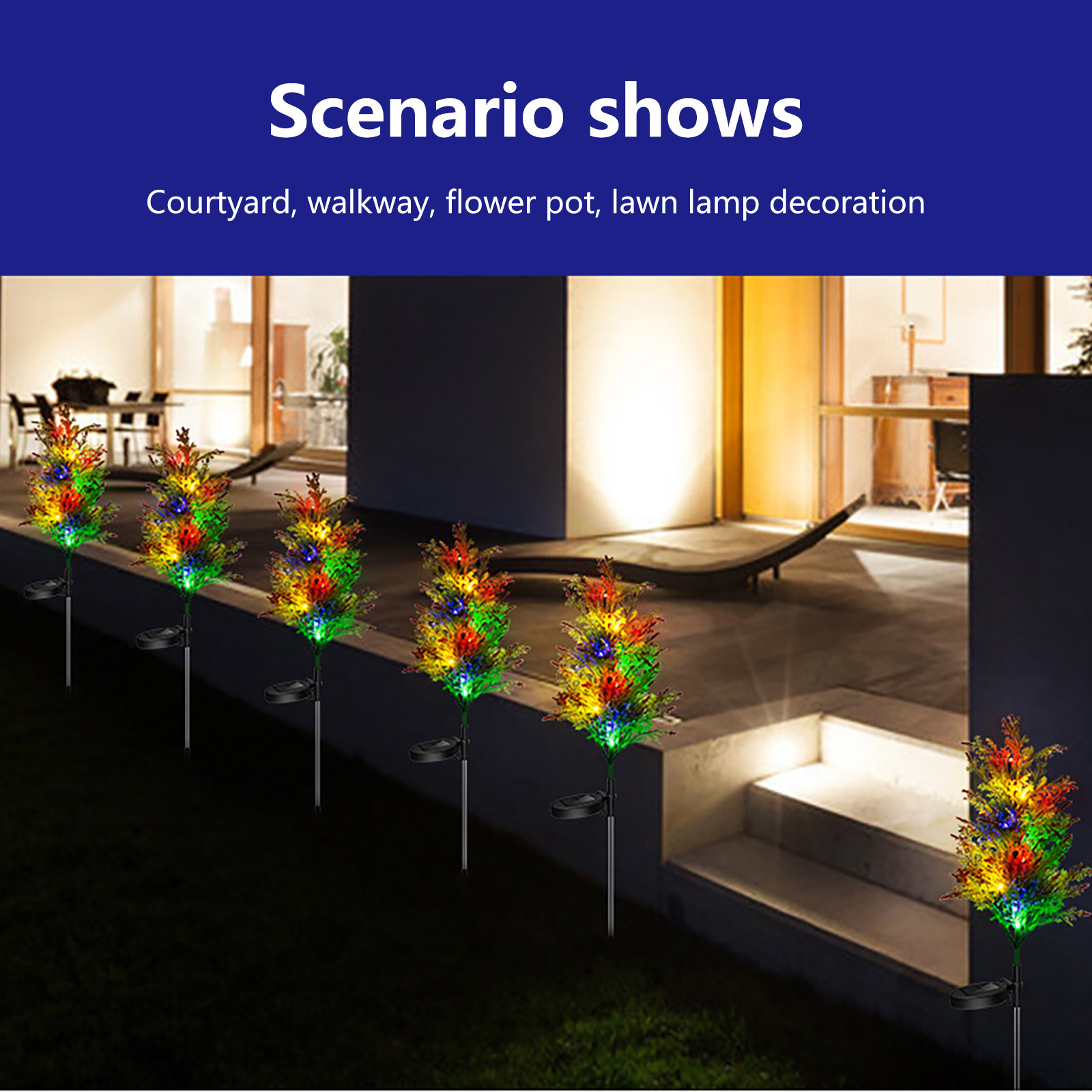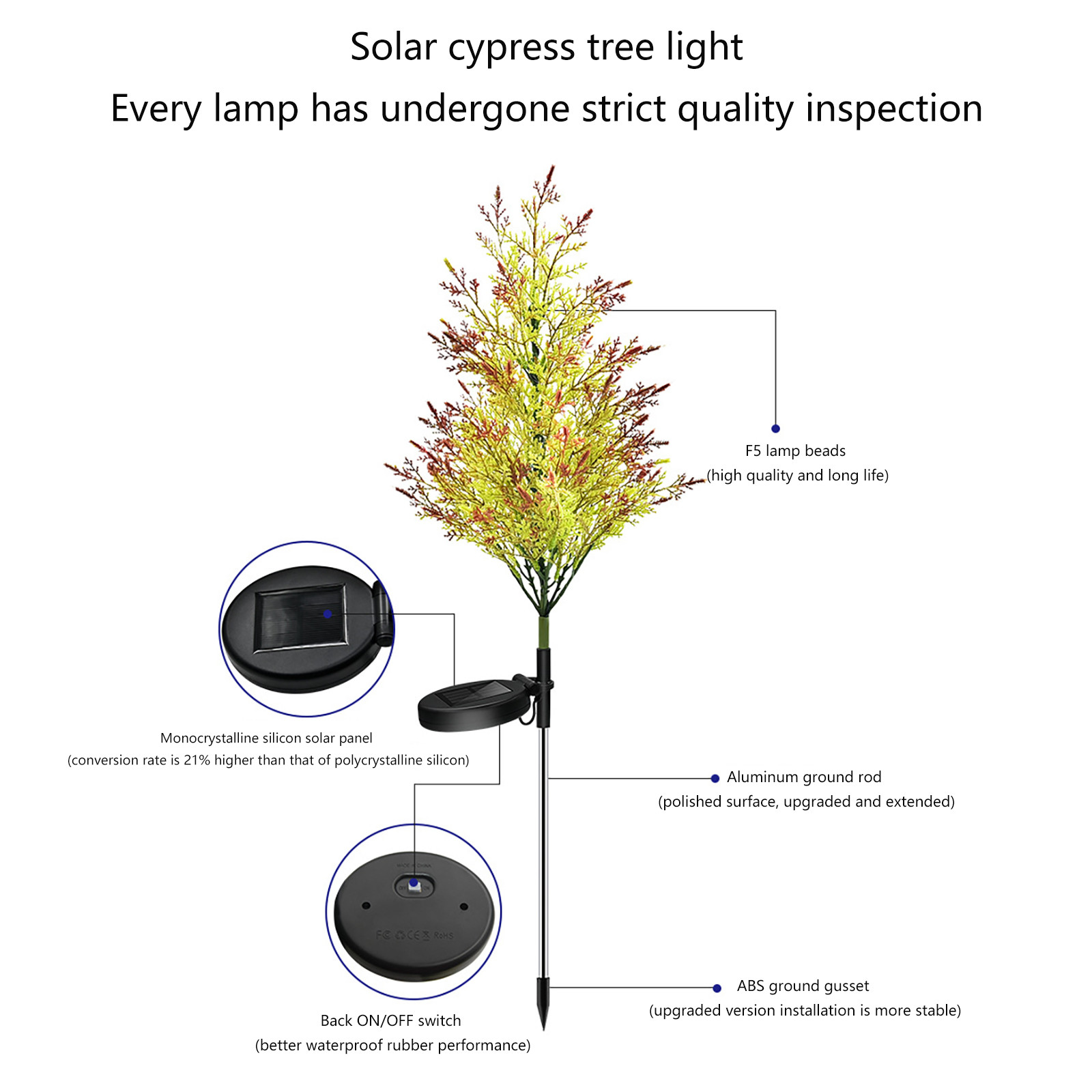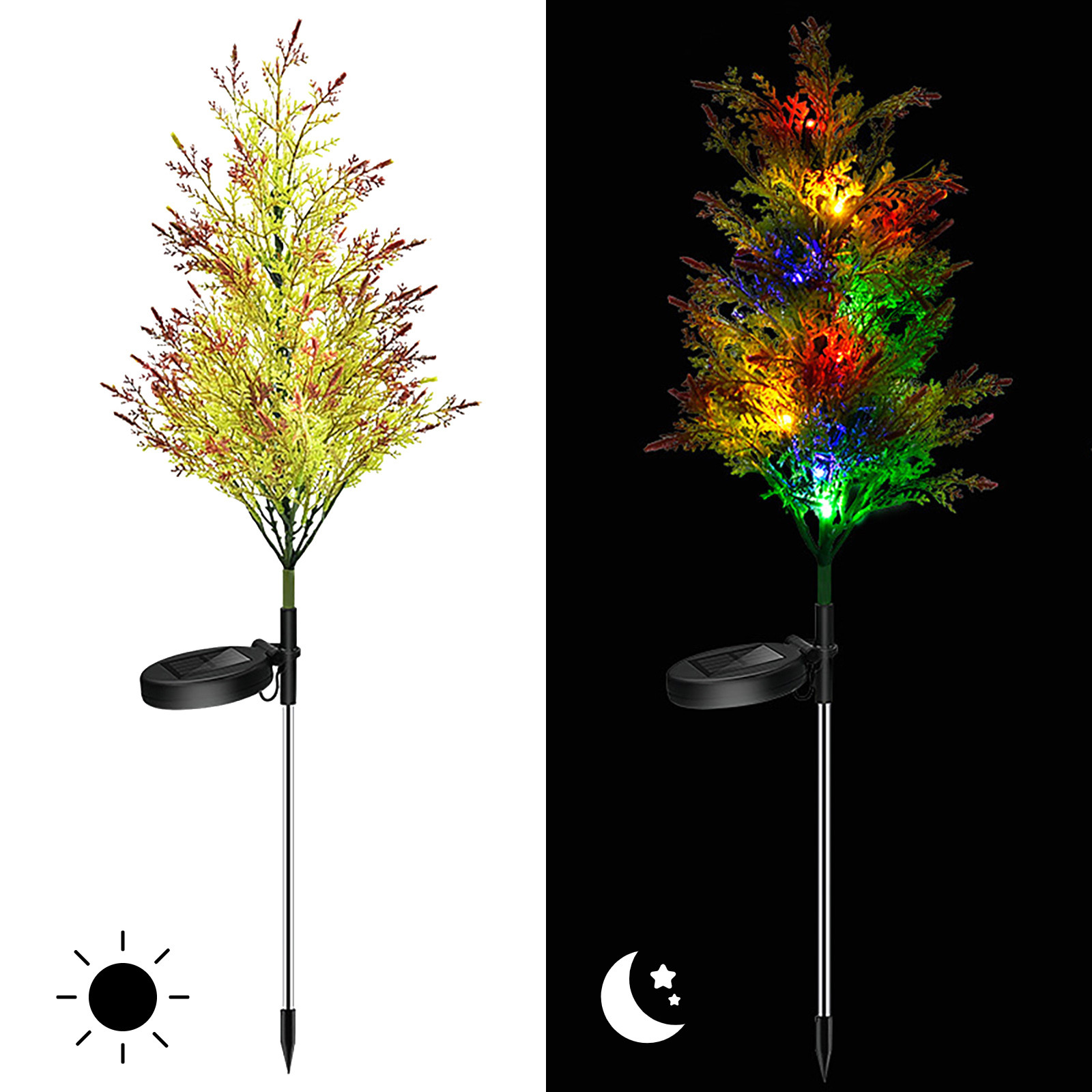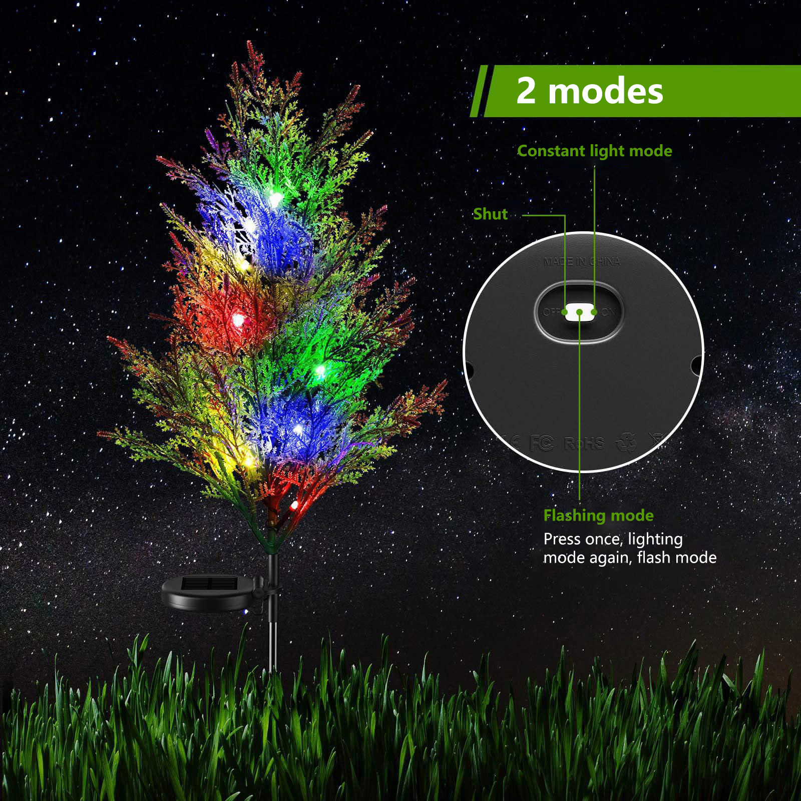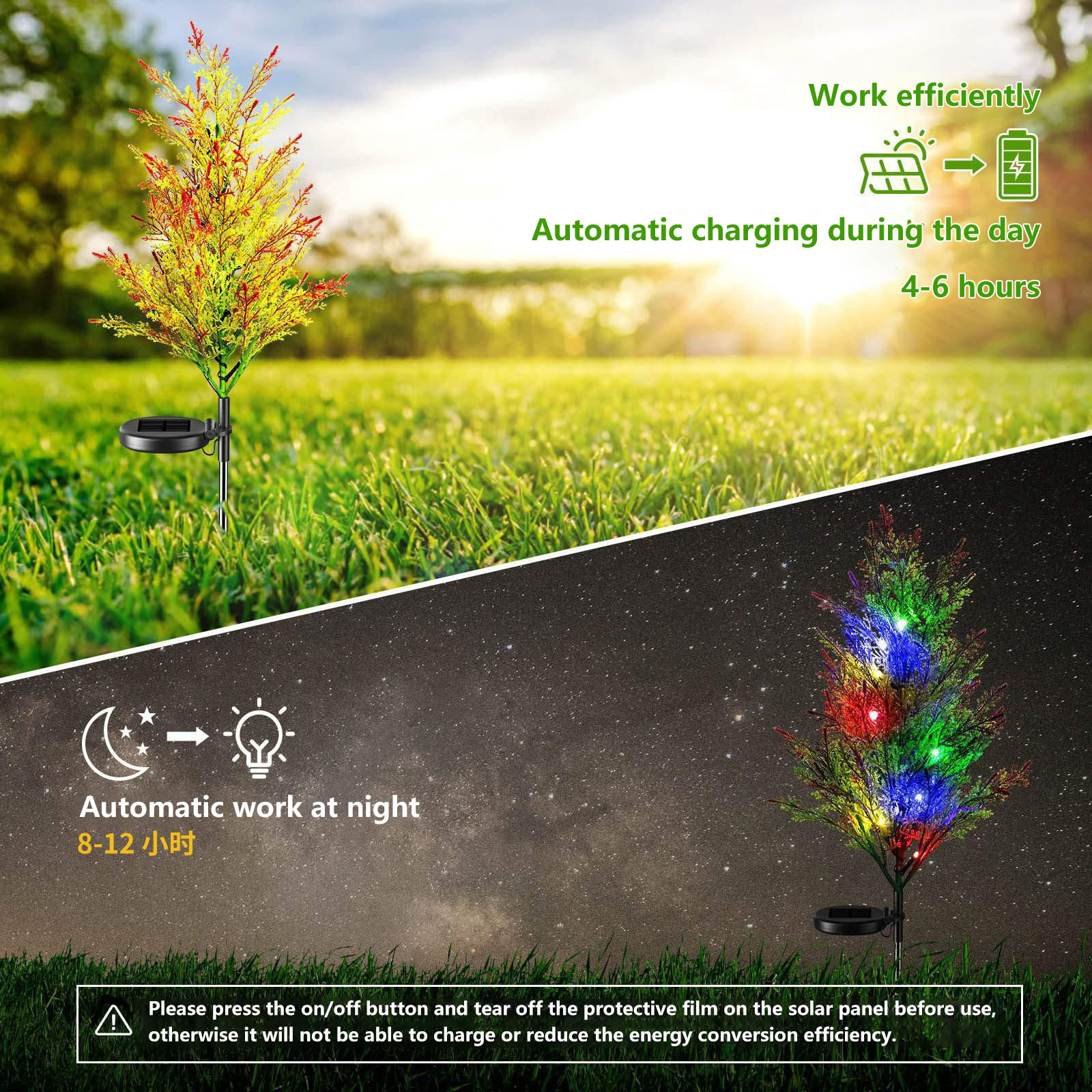 [Два режима и автоматическое открытие/закрытие]: солнечный светильник для заднего двора деревья имеют постоянный свет и мигают двумя лампами. Включите переключатель в нижней части панели солнечных батарей, затем выберите эффект, который вам нравится.