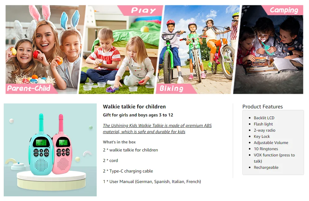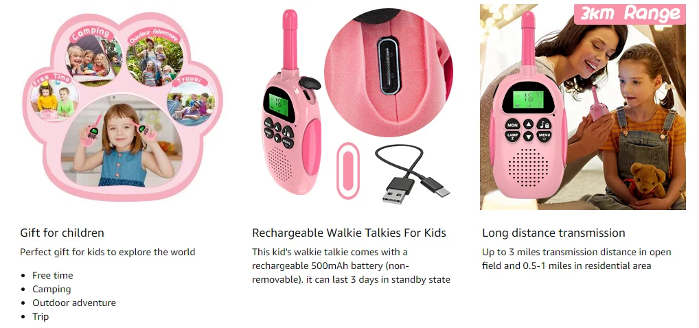 【What's in Box】 2 * Детская рация, 2 * шнур, 2 * зарядный кабель, 1 * Руководство пользователя (французский, английский, немецкий, испанский, итальянский)
