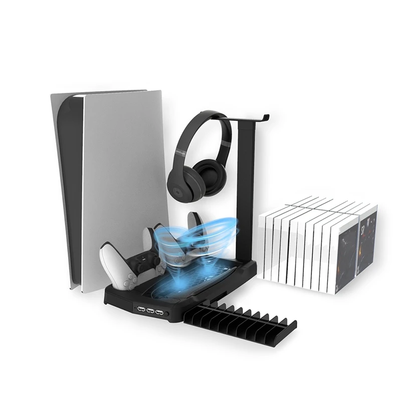 [Все в одном дизайне] Этот стенд PS5 имеет дизайн «все в одном». Он может не только заряжать консоль контроллера двойного зондирования PS5, но и включать 2 охлаждающих вентилятора для непрерывного охлаждения хоста PS5 и хранения собственного источника питания через оптический диск. Храните 20 компакт-дисков одновременно.