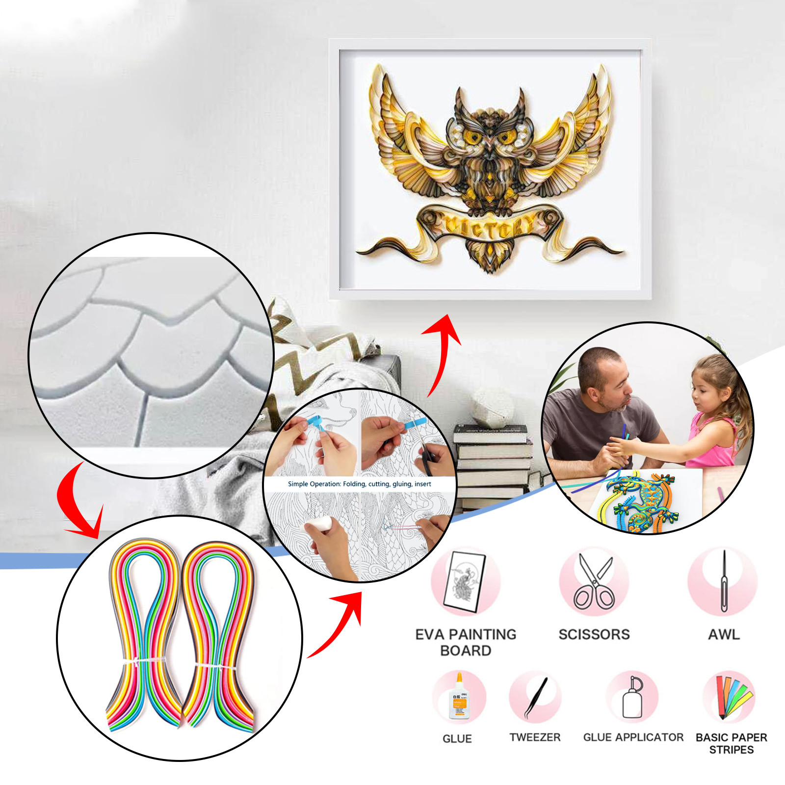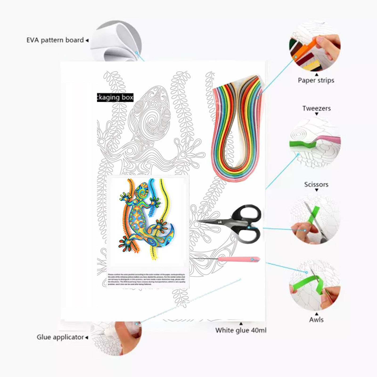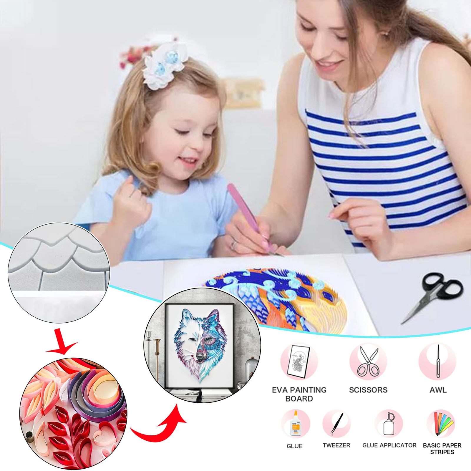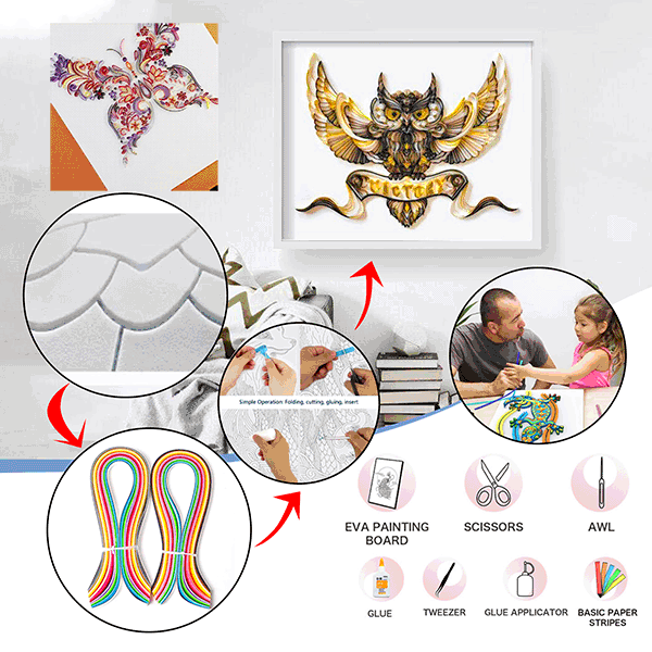 В комплекте Набор инструментов: посылка содержит доски из ЭВА, бумажные полоски, белые Клей, аппликатор клея, пинцет, Awls, ножницы и инструкции. Давайте Будьте креативны с помощью простого и профессионального набора для рисования из бумаги.
