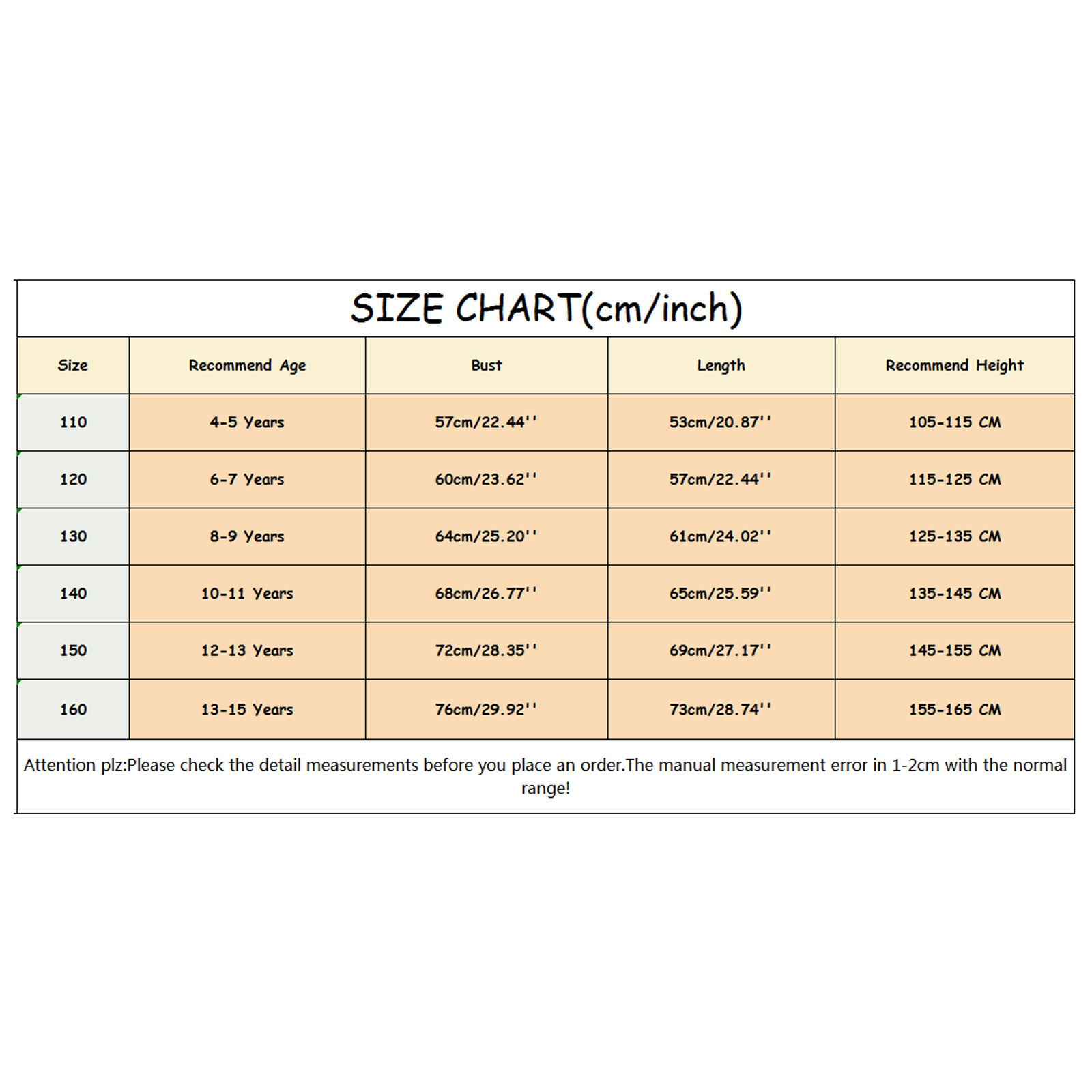 Размеры Рекомендуемый возраст Бюст Длина Рекомендуемая высота 110 От 4 до 5 лет 57 см/22,44'' 53 см/20,87'' 105-115 см 120 От 6 до 7 лет 60 см/23,62'' 57 см/22,44'' 115-125 см 130 От 8 до 9 лет 64 см/25,20'' 61 см/24,02'' 125-135 см 140 От 10 до 11 лет 68 см/26,77'' 65 см/25,59'' 135-145 см 150 12-13 лет 72 см/28,35'' 69 см/27,17'' 145-155 см 160 13-15 лет 76 см/29,92'' 73 см/28,74'' 155-165 смРешил заказать для своей дочки платье на Новый Год. Приглянулось данный товар. Доставку ждал около трех месяцев, главное, что пришел... Читать отзыв полностью...