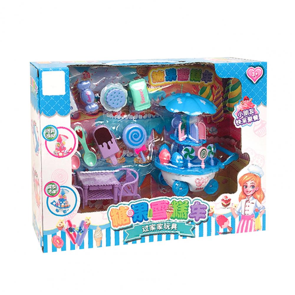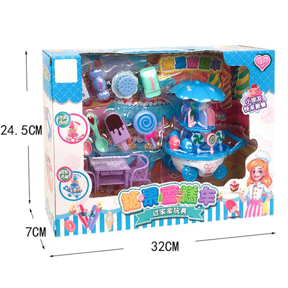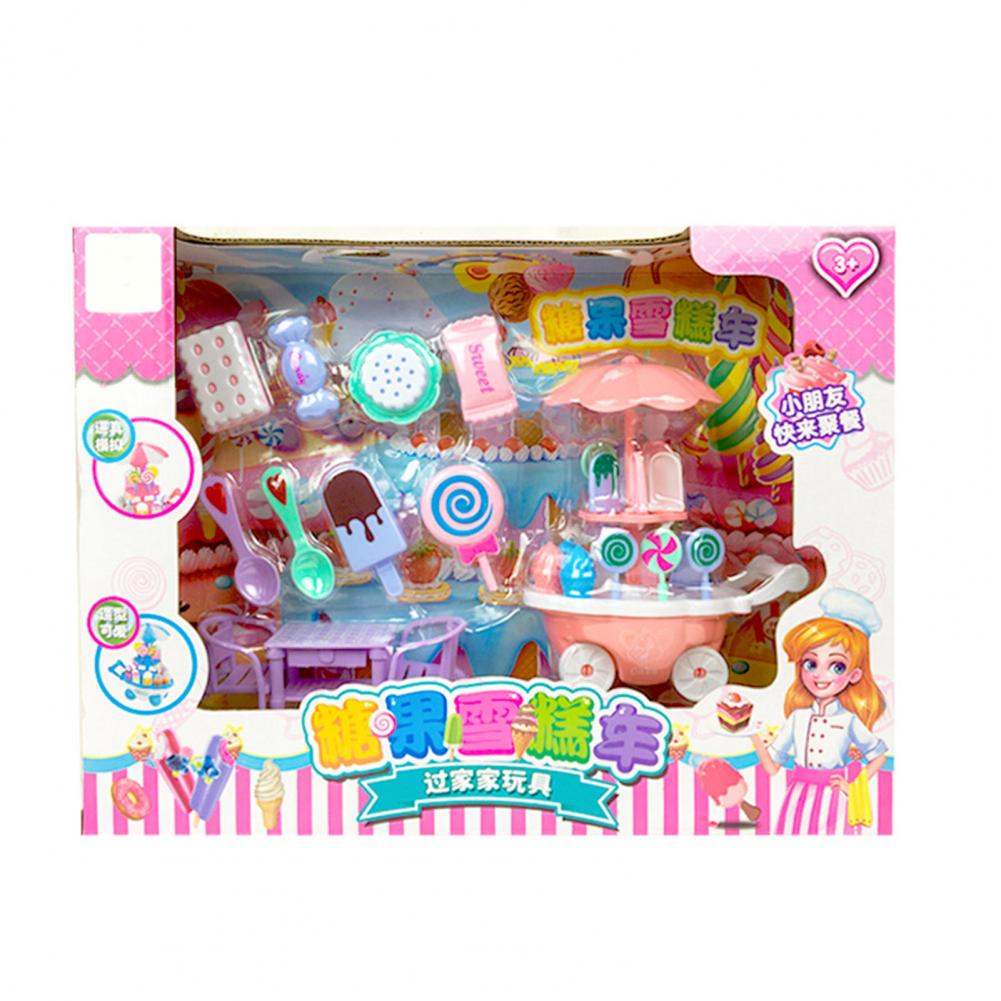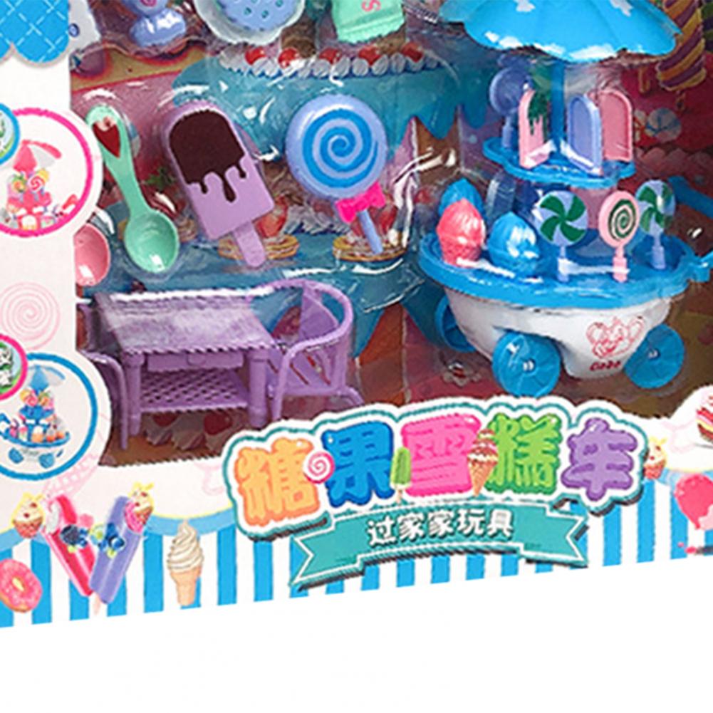 Это полный игровой набор игрушек для дома, включающий множество аксессуаров, в том числе имитированное и гладкое мороженое, леденцы, зонты для создания красочной жизненной сцены для ролевых игр.