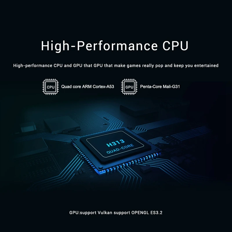 Hardware Specifications: CPU: Allwinner H313 Quad-core ARM Cortex-A53 processor. GPU: G31. SDRAM: 2GB. FLASH: 16GB. WiFi: Built in 2.4G WiFi Support IEEE 802.11 b/g/n. LAN Ethernet: 10M/100M