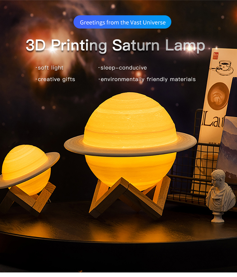Specification: Product name: 3D printing Saturn lamp Lighting model: LED lamp beads Product material: Food grade biodegradable PLA Production process: 3D printing Battery type: polymer lithium battery Battery capacity: 1000 mAh Charging time: 1 -2 hours Working hours: 6-10 hours Rated voltage: 110-220V Surface accuracy: 12.5UM Product voltage: 3.7V Product power: 1W Interface type: Micro USB Average service life: 20000 hours Product color: remote control 16 colors Product size: D15cm Package included: 1 x 3D Printing Saturn Lamp 1 x Solid wood bracket 1 x Charging cable 1 x Manual 1 x Remote control