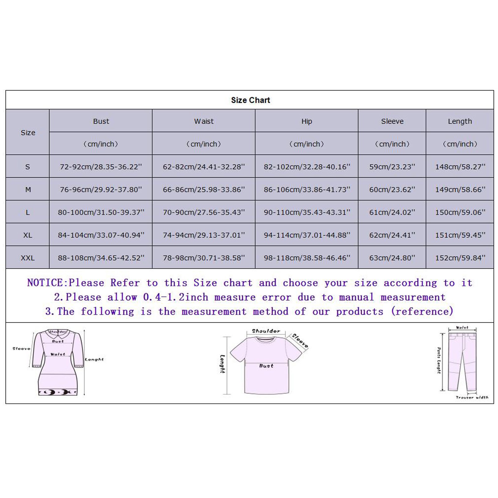 Размеры Бюст Талия Бедра Рукав Длина S 72-92 см/28,35-36,22 дюйма 62-82 см/24,41-32,28'' 82-102 см/32,28-40,16'' 59 см/23,23'' 148 см/58,27'' М 76-96 см/29,92-37,80'' 66-86 см/25,98-33,86'' 86-106 см/33,86-41,73'' 60 см/23,62'' 149 см/58,66'' L 80-100 см/31,50-39,37'' 70-90 см/27,56-35,43'' 90-110 см/35,43-43,31'' 61 см/24,02'' 150 см/59,06'' XL 84-104 см/33,07-40,94 дюйма 74-94 см/29,13-37,01'' 94-114 см/37,01-44,88 дюйма 62 см/24,41'' 151 см/59,45'' XXL 88-108 см/34,65-42,52'' 78-98 см/30,71-38,58'' 98-118 см/38,58-46,46'' 63 см/24,80'' 152 см/59,84''