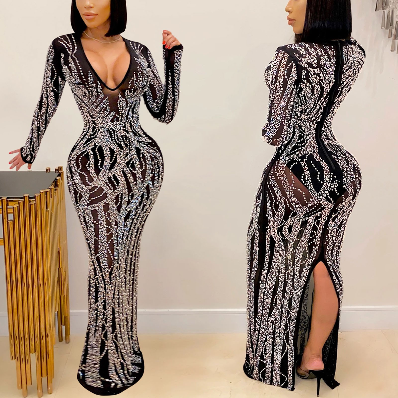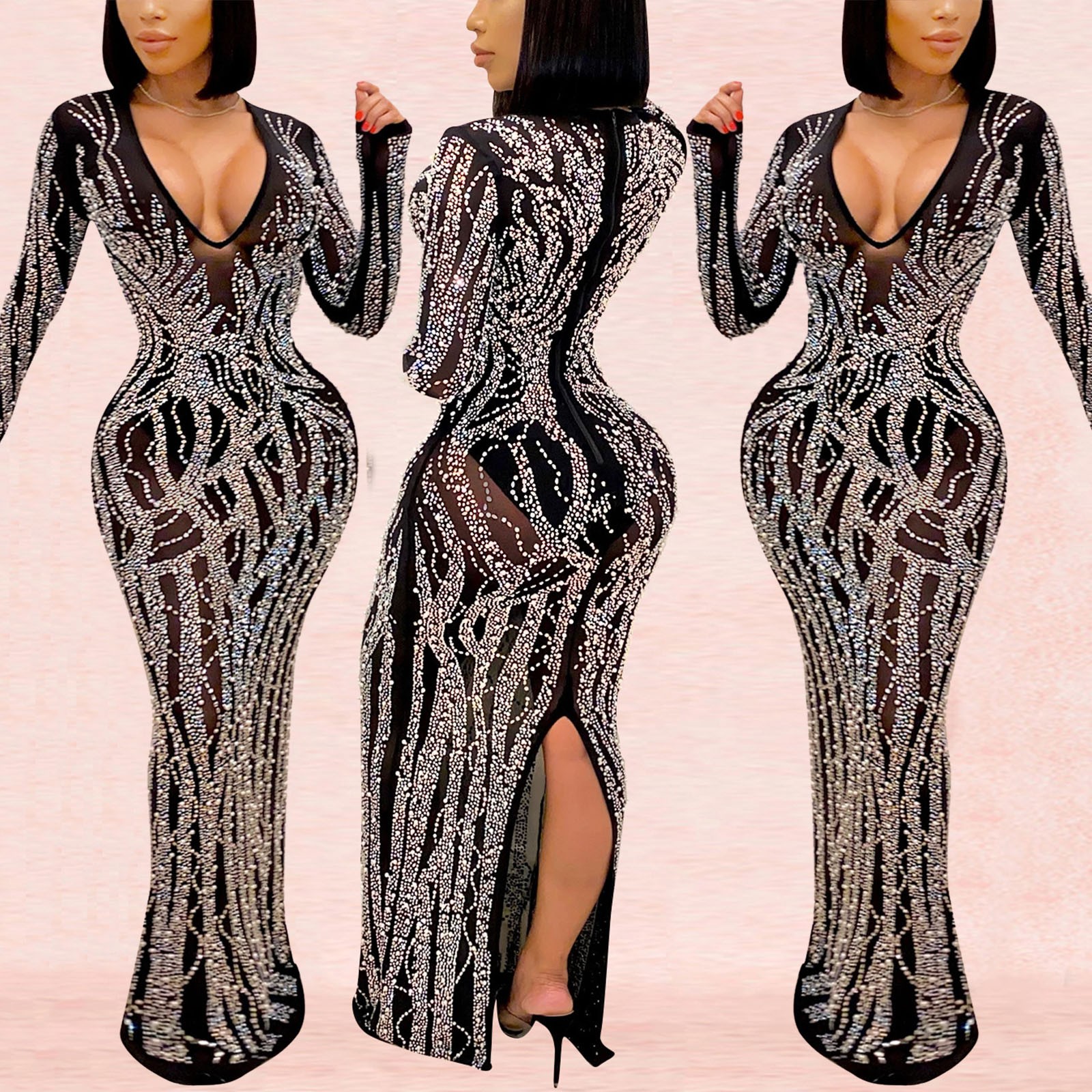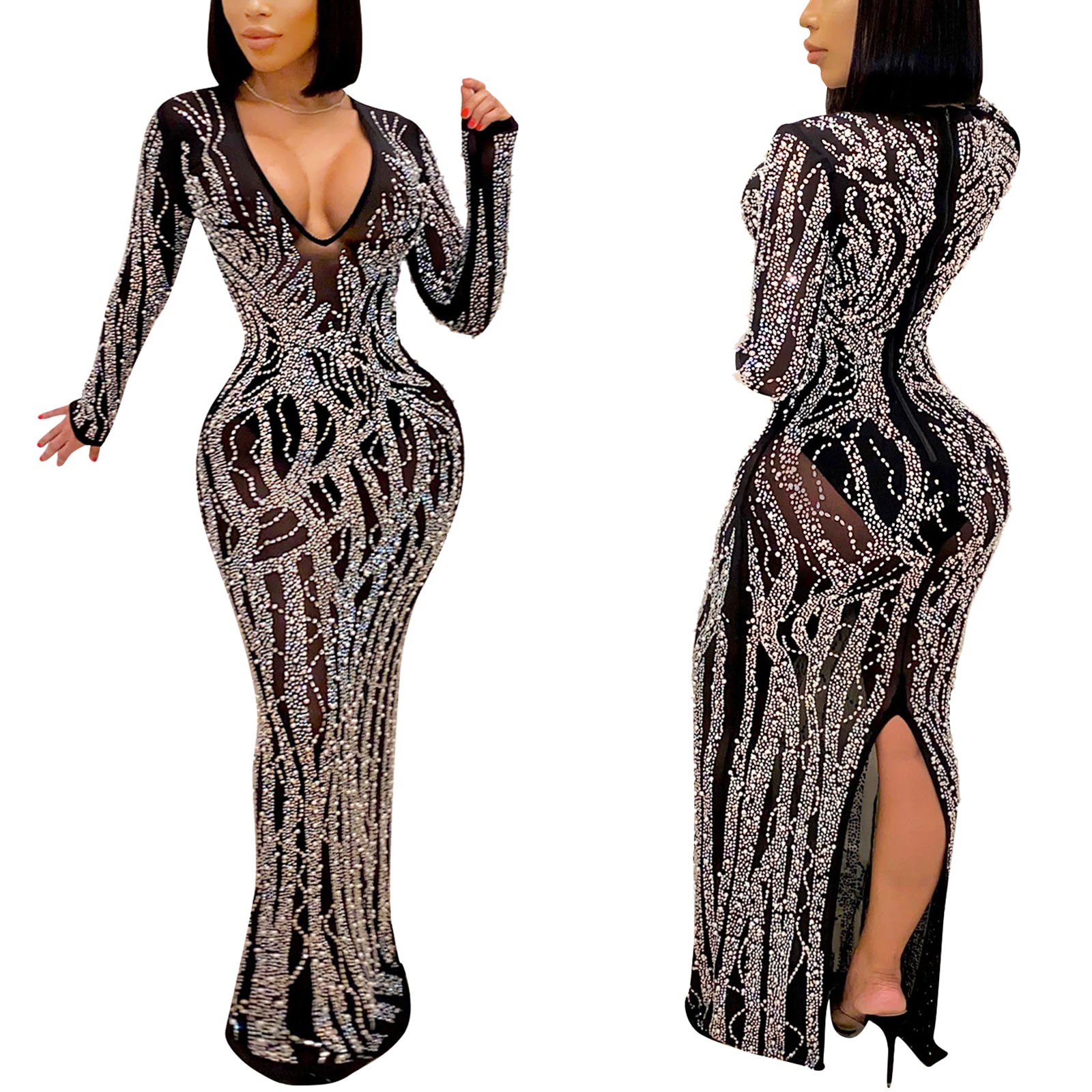 Стразы, сексуальное платье для женщин, прозрачное, с высоким разрезом, прозрачное, Сетчатое, вечерние, блестящее, с длинным рукавом, с v-образным вырезом, Клубное платье, Robe Mujer