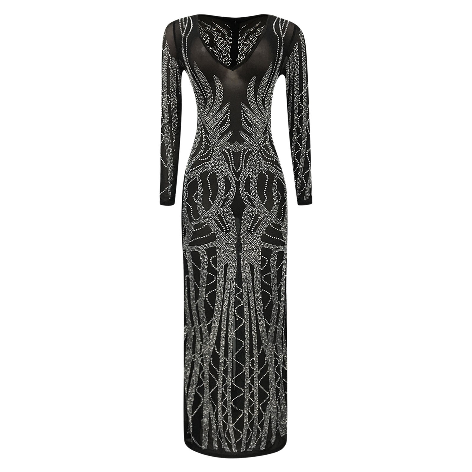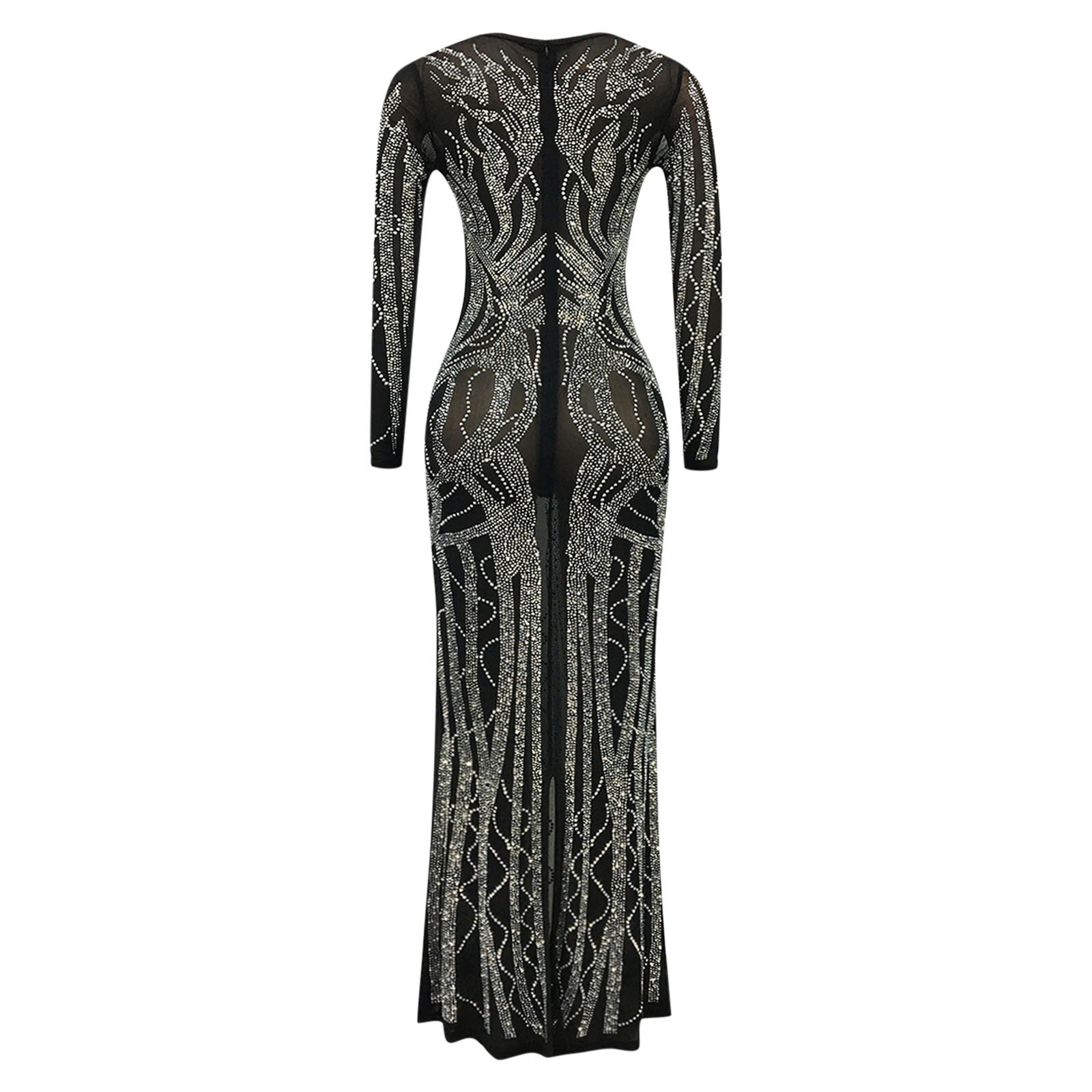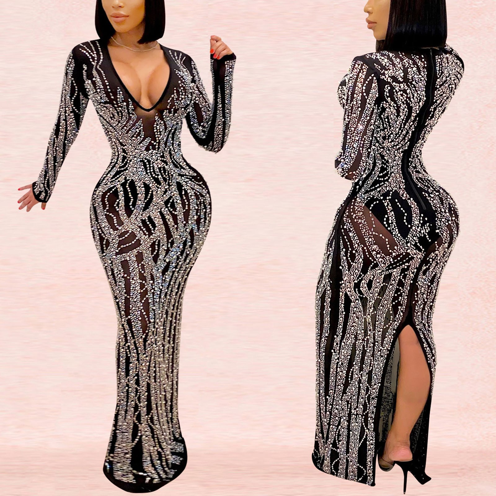 Стразы, сексуальное платье для женщин, прозрачное, с высоким разрезом, прозрачное, Сетчатое, вечерние, блестящее, с длинным рукавом, с v-образным вырезом, Клубное платье, Robe Mujer