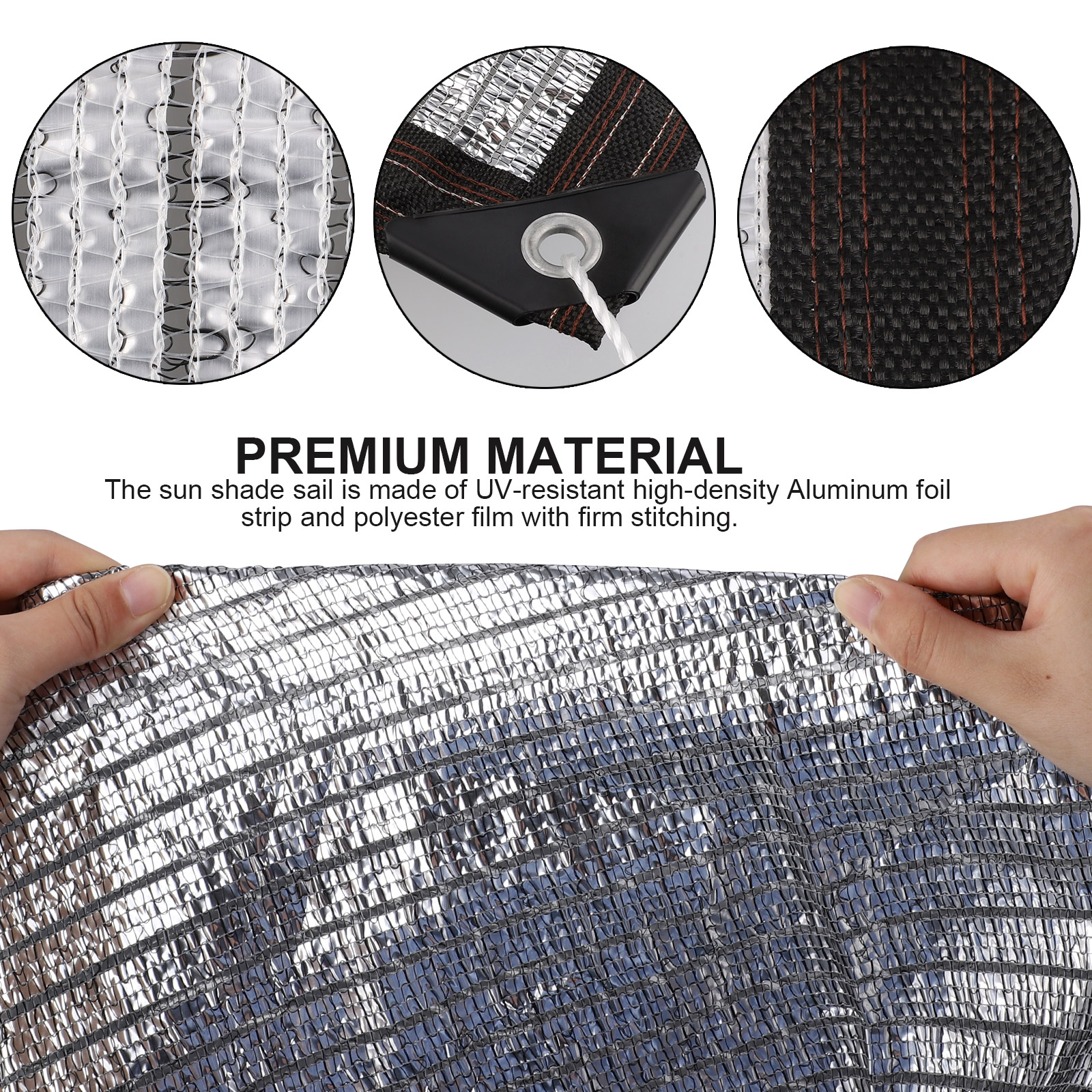 1. Премиум-Материал: солнцезащитный парус изготовлен из УФ-устойчивой алюминиевой фольги высокой плотности и полиэфирной пленки с твердой строчкой. В каждом уголке есть прочные кольца из нержавеющей стали, так что Парус От Солнца может быть легко прикреплен к любой прочной точке соединения, чтобы обеспечить защиту от солнца и индивидуальный дизайн в любых местах, которые вы хотите.