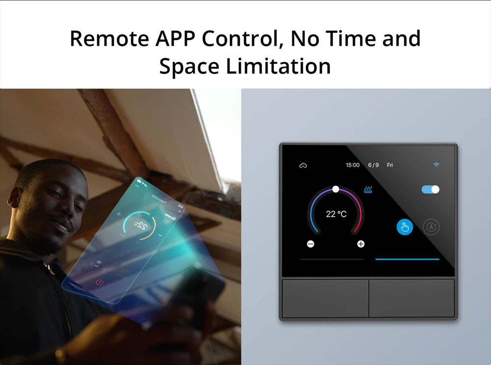 Настенный выключатель NSPanel Smart Scene оснащен встроенным мощным термостатом и экологическими датчиками. Вы можете устанавливать различные температуры в помещении в течение различных периодов времени, и NSPanel автоматически запускает нагревание или охлаждение оборудования в соответствии с вашими условиями настройки, чтобы сохранить комнату при удобной температуре. Более того, у NSPanel есть функция управления на основе сценария, вы можете установить различные режимы для пробуждения, работы, развлечений и сна, а также переключать режимы в любое время.